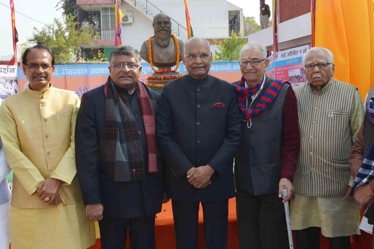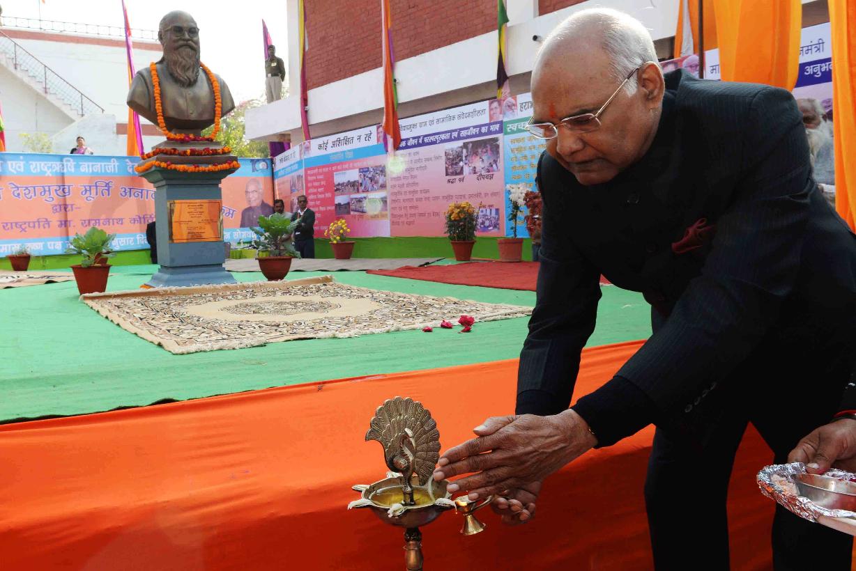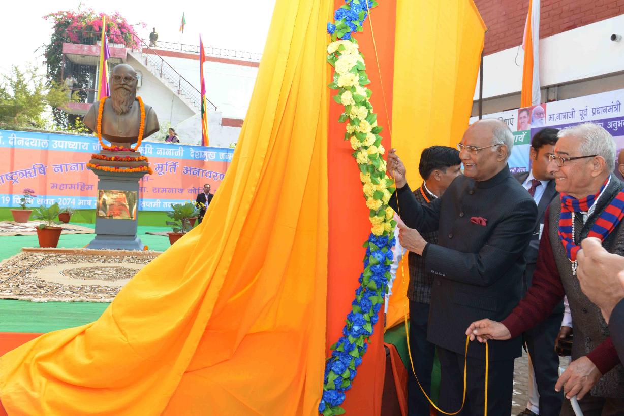 | Caption: | The President of India, Shri Ram Nath Kovind unveiling the statue of Rashtrarishi Nanaji Deshmukh, at Arogyadham Complex, Deendayal Research Institute (DRI), in Chitrakoot, Madhya Pradesh on January 08, 2018. |