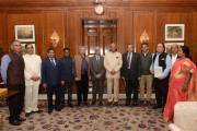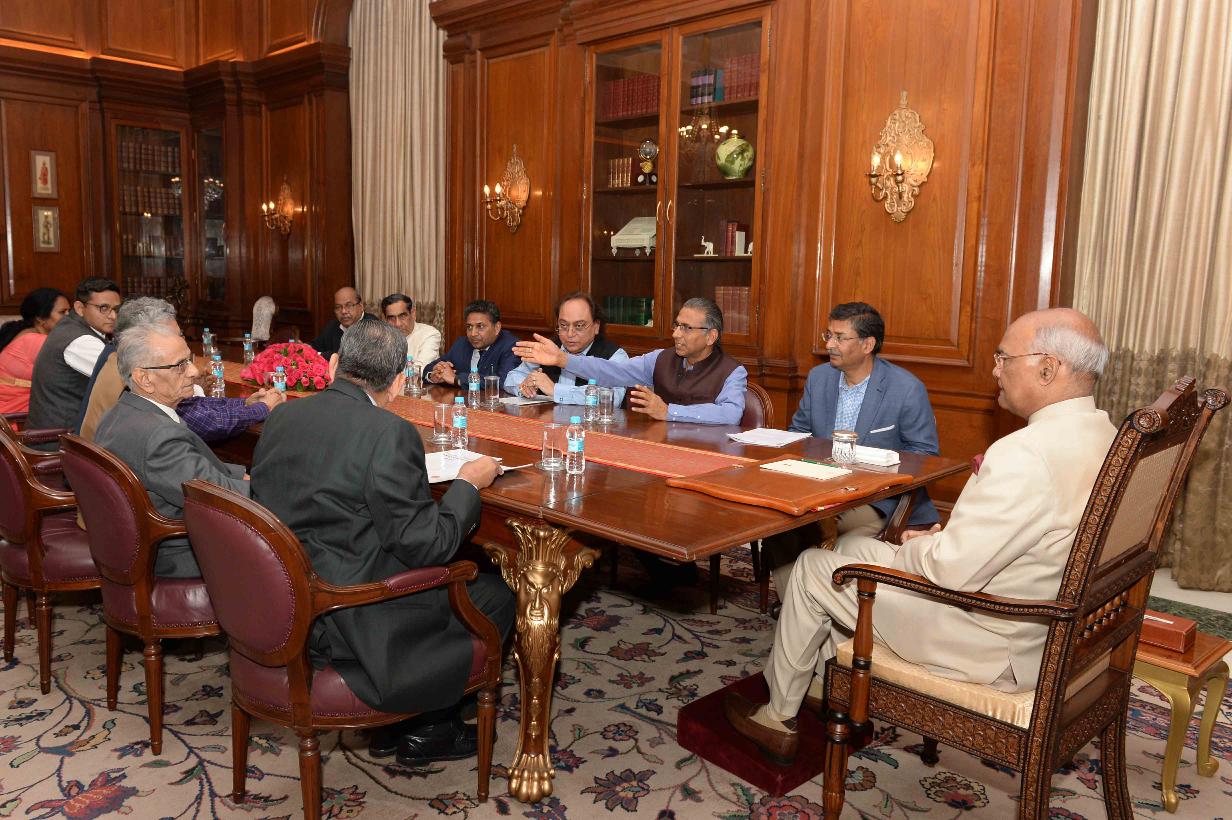 | Caption: | Shri Justice B.C. Patel, former Chief Justice, Jammu & Kashmir High Court & Chairman, Fact Finding Committee for political violence at Kannur, Kerala and Trustees of Call for Justice meeting with the President of India, Shri Ram Nath Kovind, at Rashtrapati Bhavan on February 28, 2018. |