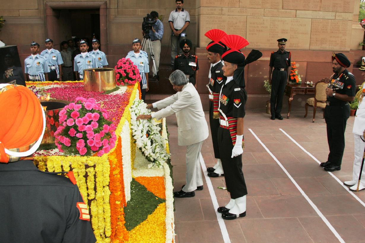 | Caption: | The President of India, Dr A P J Abdul Kalam paying tributes at Amar Jawan Jyoti at Indian Gate in New Delhi on Aug 15, 2005 |