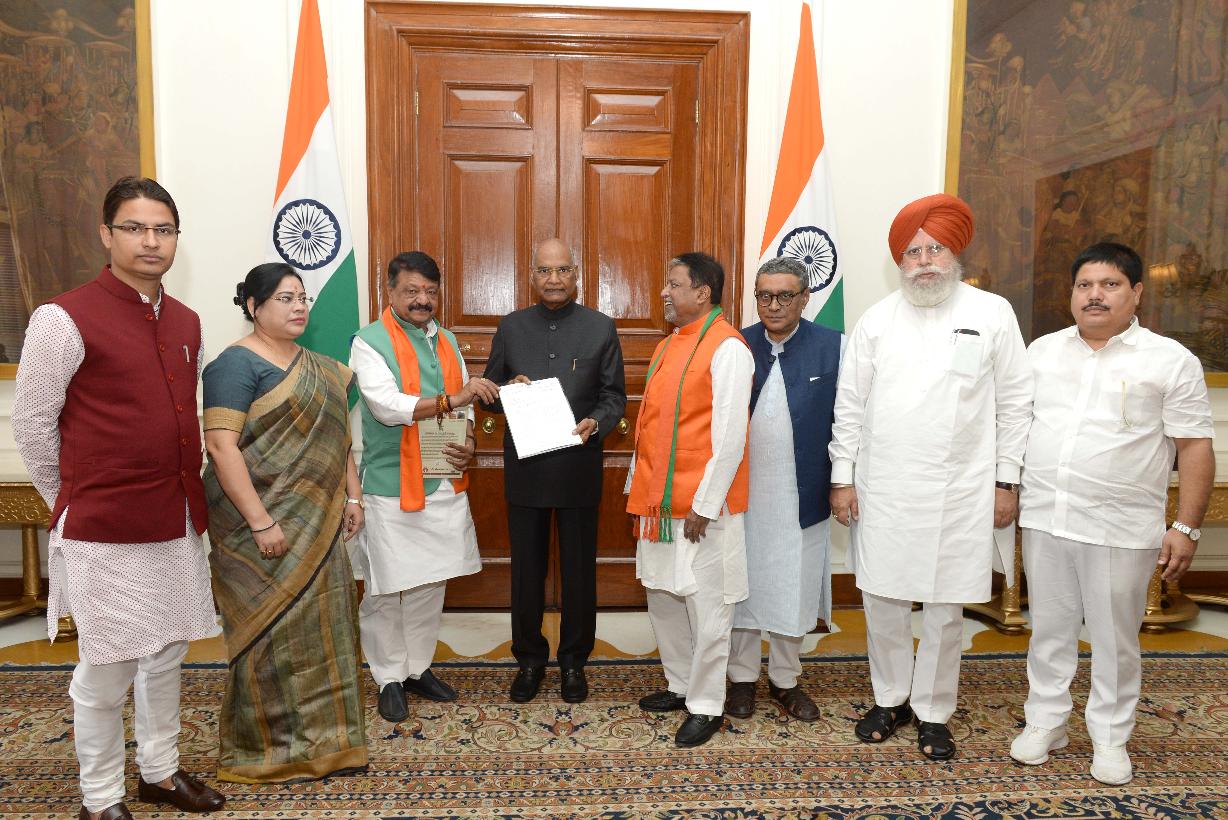 The Minister of State for Women and Child Development, Ms. Debasree Chaudhuri along with Shri S.S. Ahluwalia, MP (LS), Shri Arjun Singh, MP (LS), Shri Raju Bista, MP (LS), Shri Mukul Roy, former Union Minister, Shri Kailash Vijayvargiya, National General Secretary, BJP and Shri Swapan Dasgupta meeting with the President of India, Shri Ram Nath Kovind, at Rashtrapati Bhavan on October 15, 2019. |