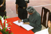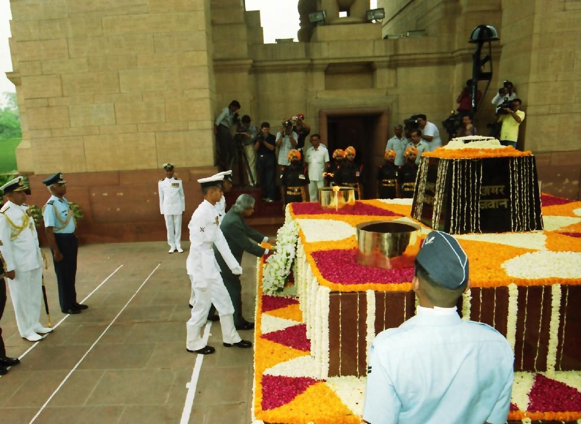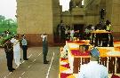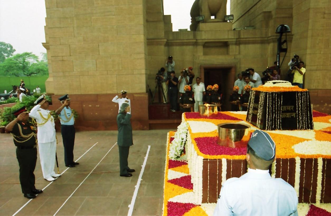 | Caption: | The President of India, Dr A P J Abdul Kalam paying tributes at the Amar Jawan Jyoti on the eve of Independence Day at the India Gate in New Delhi on Aug 14, 2003 |