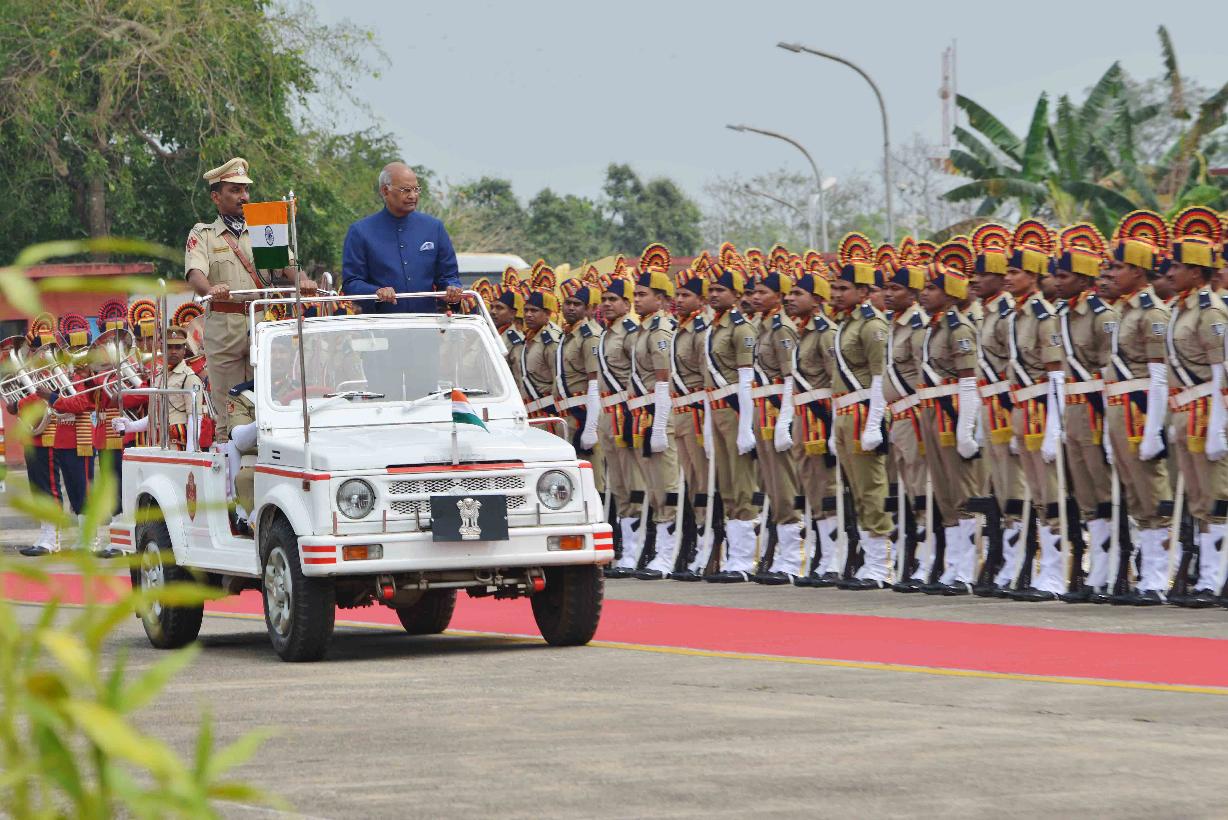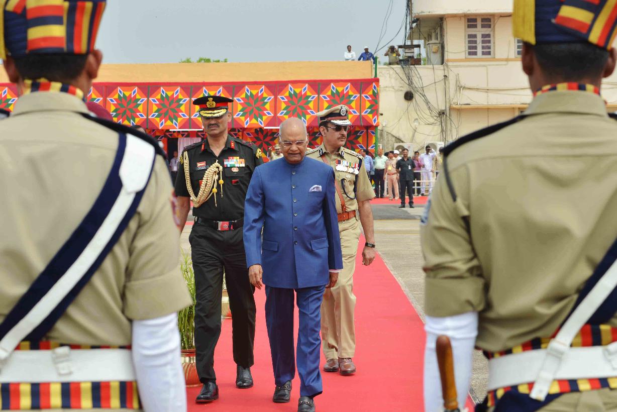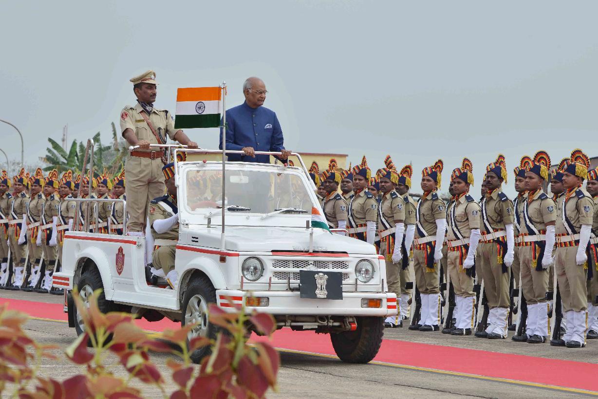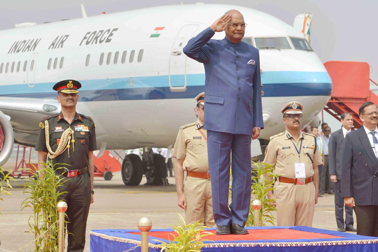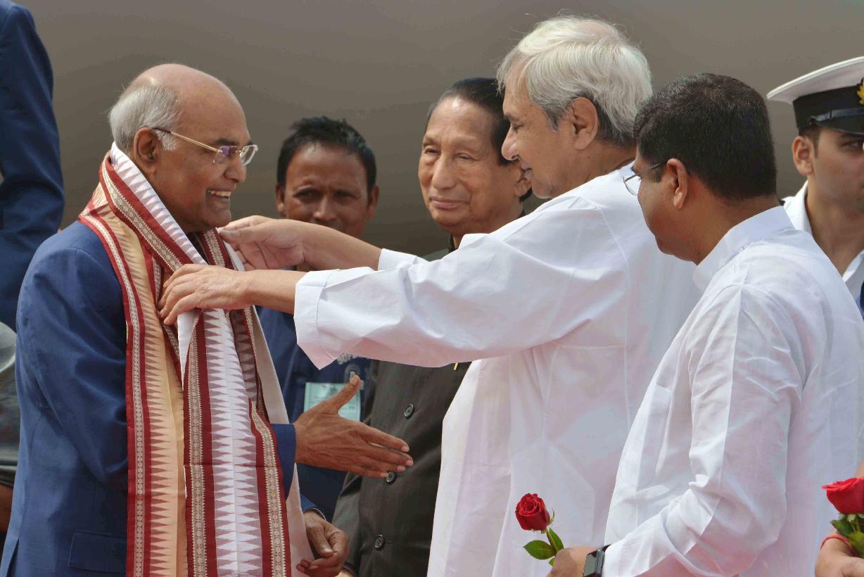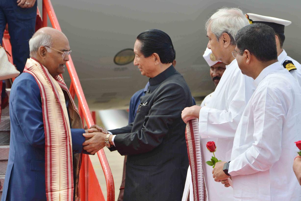 | Caption: | The President of India, Shri Ram Nath Kovind being received by the Governor, Odisha, Shri S.C. Jamir, the Chief Minister, Odisha, Shri Naveen Patnaik and the Union Minister for Petroleum & Natural Gas and Skill Development & Entrepreneurship, Shri Dharmendra Pradhan, on his ceremonial arrival, at Bhubaneswar, in Odisha on March 17, 2018. |