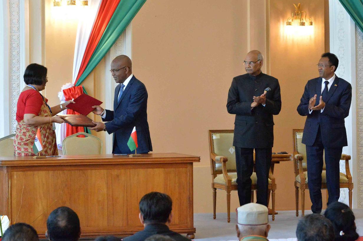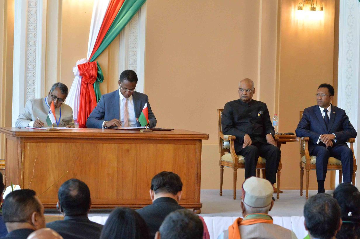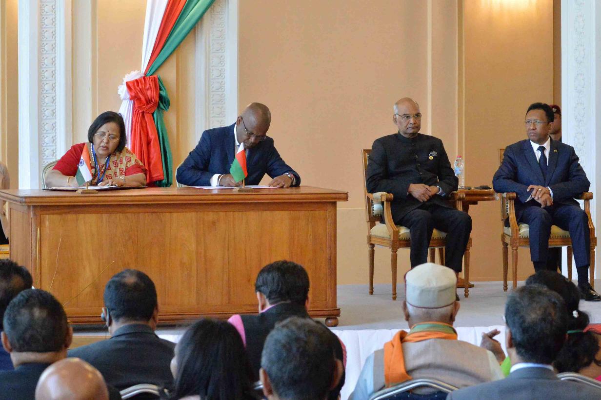 | Caption: | The President of India, Shri Ram Nath Kovind and the President of Madagascar, H.E. Mr. Hery Rajaonarimampianina witnessing the various signing of agreements/MOUs between India and Madagascar, at Presidential Lavoloha Palace, in Madagascar on March 14, 2018. |