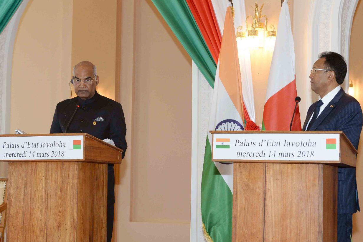 | Caption: | The President of India, Shri Ram Nath Kovind and the President of Madagascar, H.E. Mr. Hery Rajaonarimampianina during Press Statements, at Presidential Lavoloha Palace, in Madagascar on March 14, 2018. |