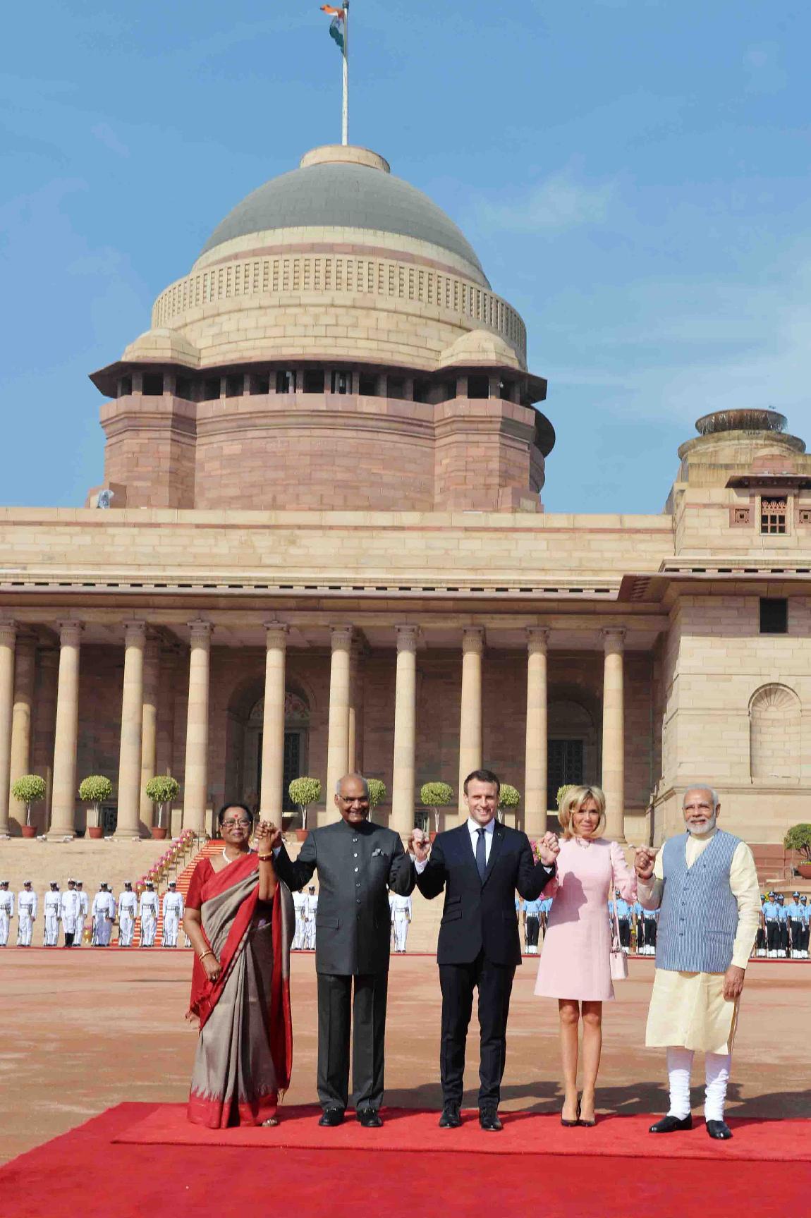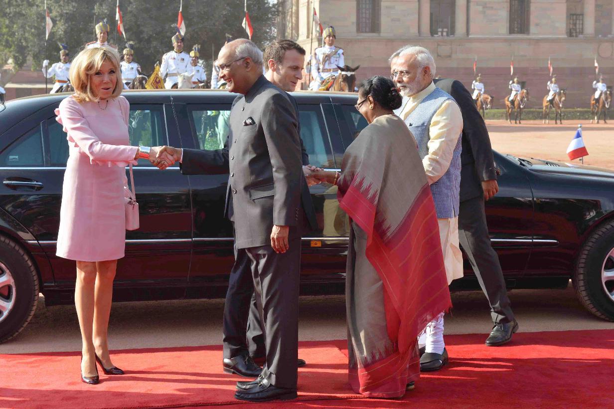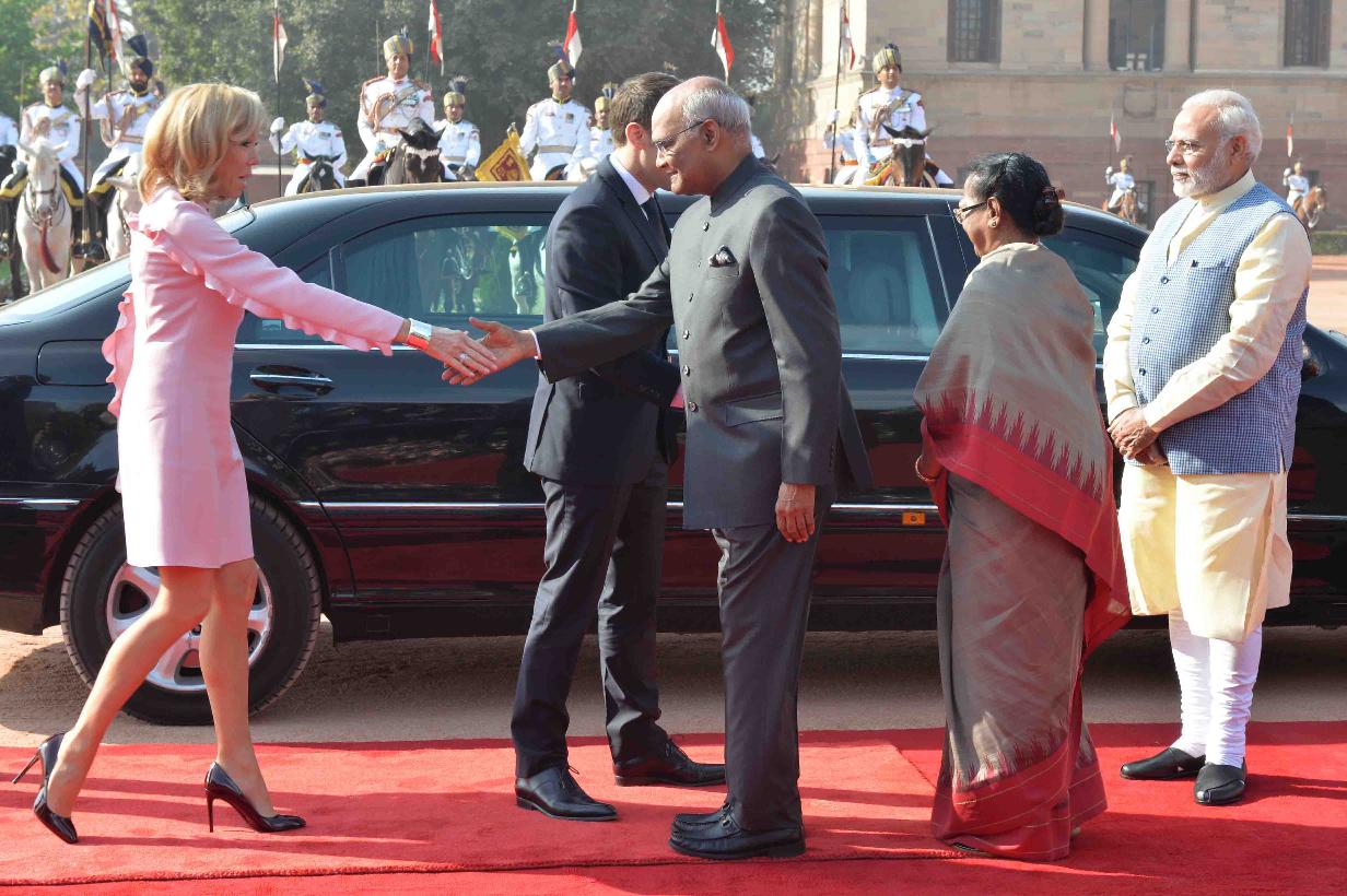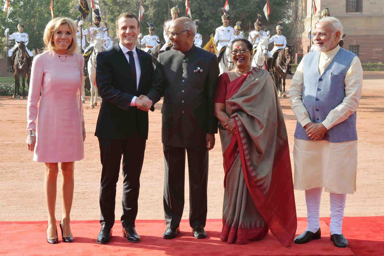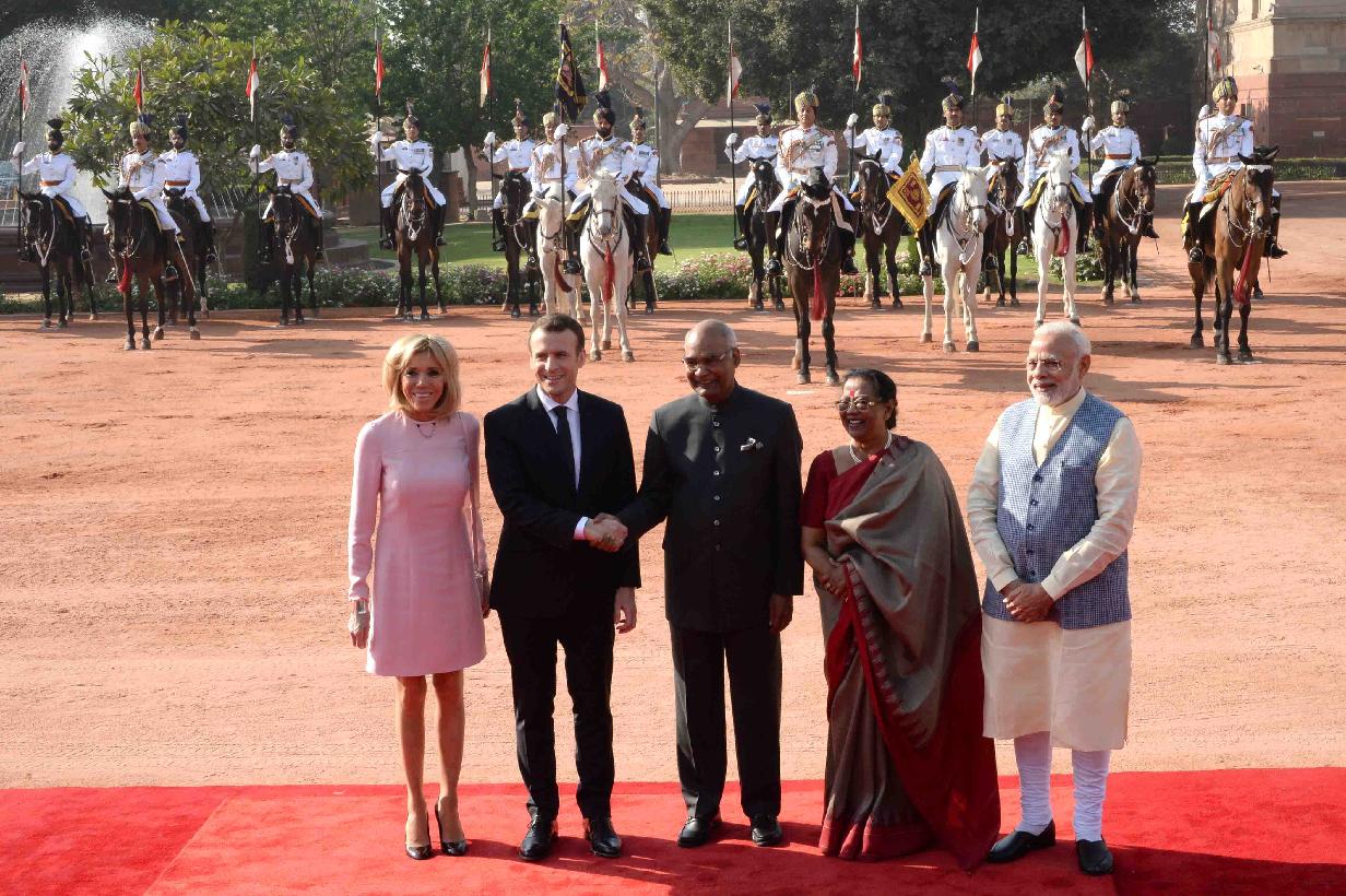 | Caption: | The President of India, Shri Ram Nath Kovind receiving the President of the French Republic, H.E. Mr. Emmanuel Macron and Mrs. Brigitte Macron during their Ceremonial Reception, at Forecourt, in Rashtrapati Bhavan on March 10, 2018. |