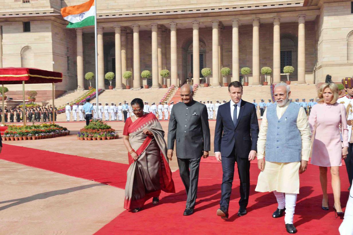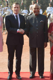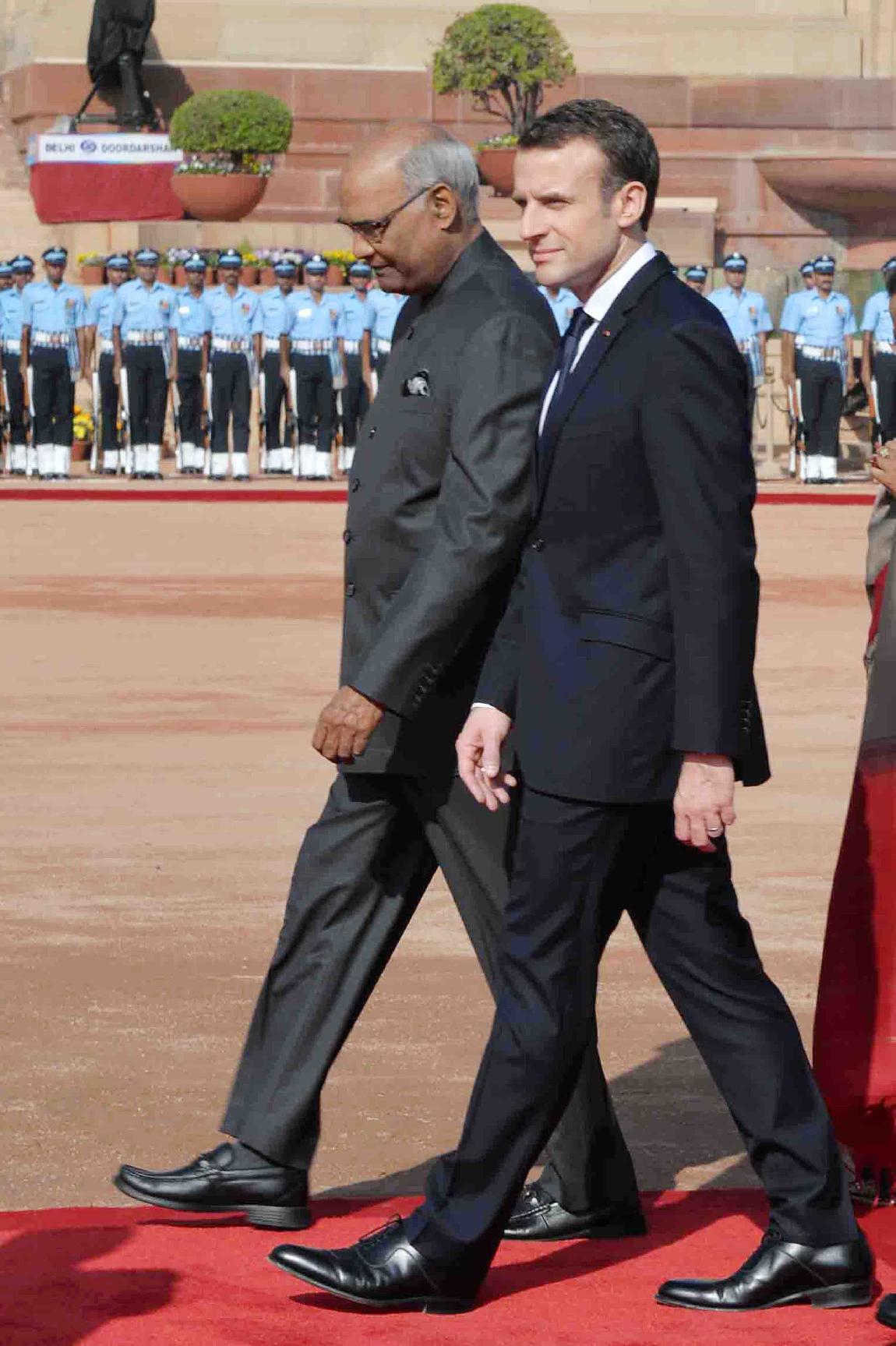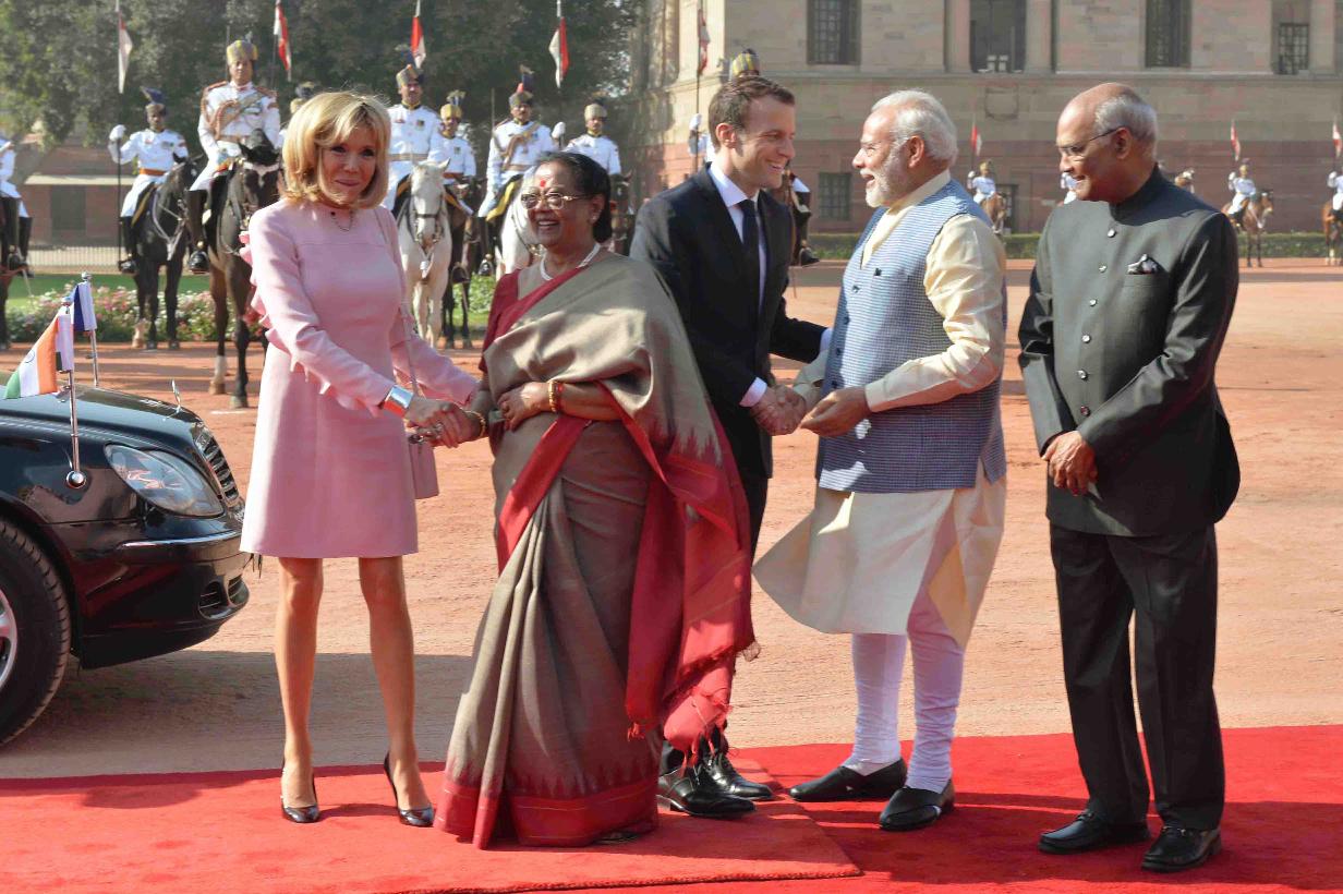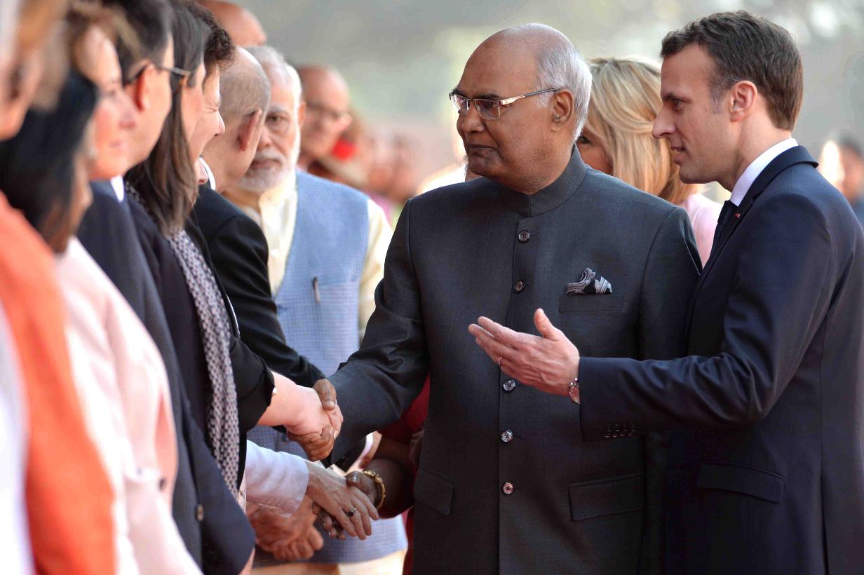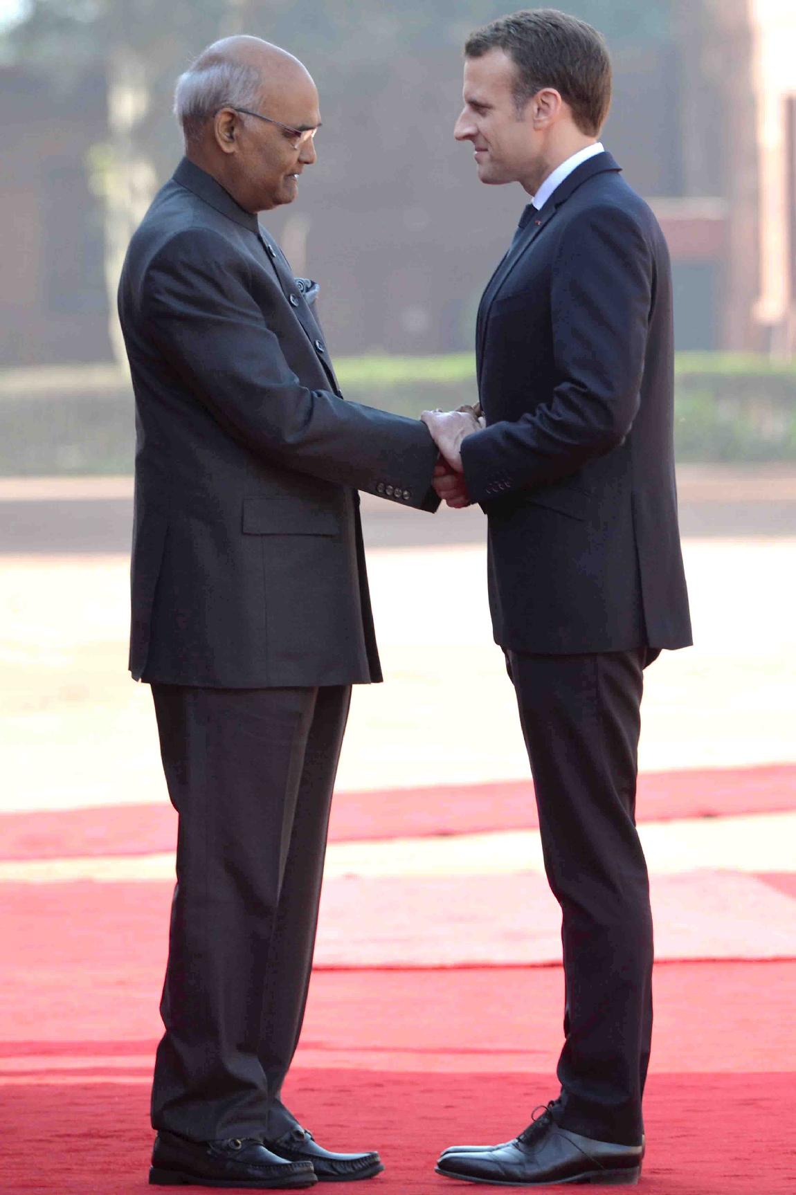 | Caption: | The President of India, Shri Ram Nath Kovind receiving the President of the French Republic, H.E. Mr. Emmanuel Macron and Mrs. Brigitte Macron during their Ceremonial Reception, at Forecourt, in Rashtrapati Bhavan on March 10, 2018. |