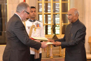 | Caption: | The Ambassador-designate of Ireland, H.E. Mr. Brendan Ward presenting his credentials to the President of India, Shri Ram Nath Kovind, at Rashtrapati Bhavan on September 25, 2019. |