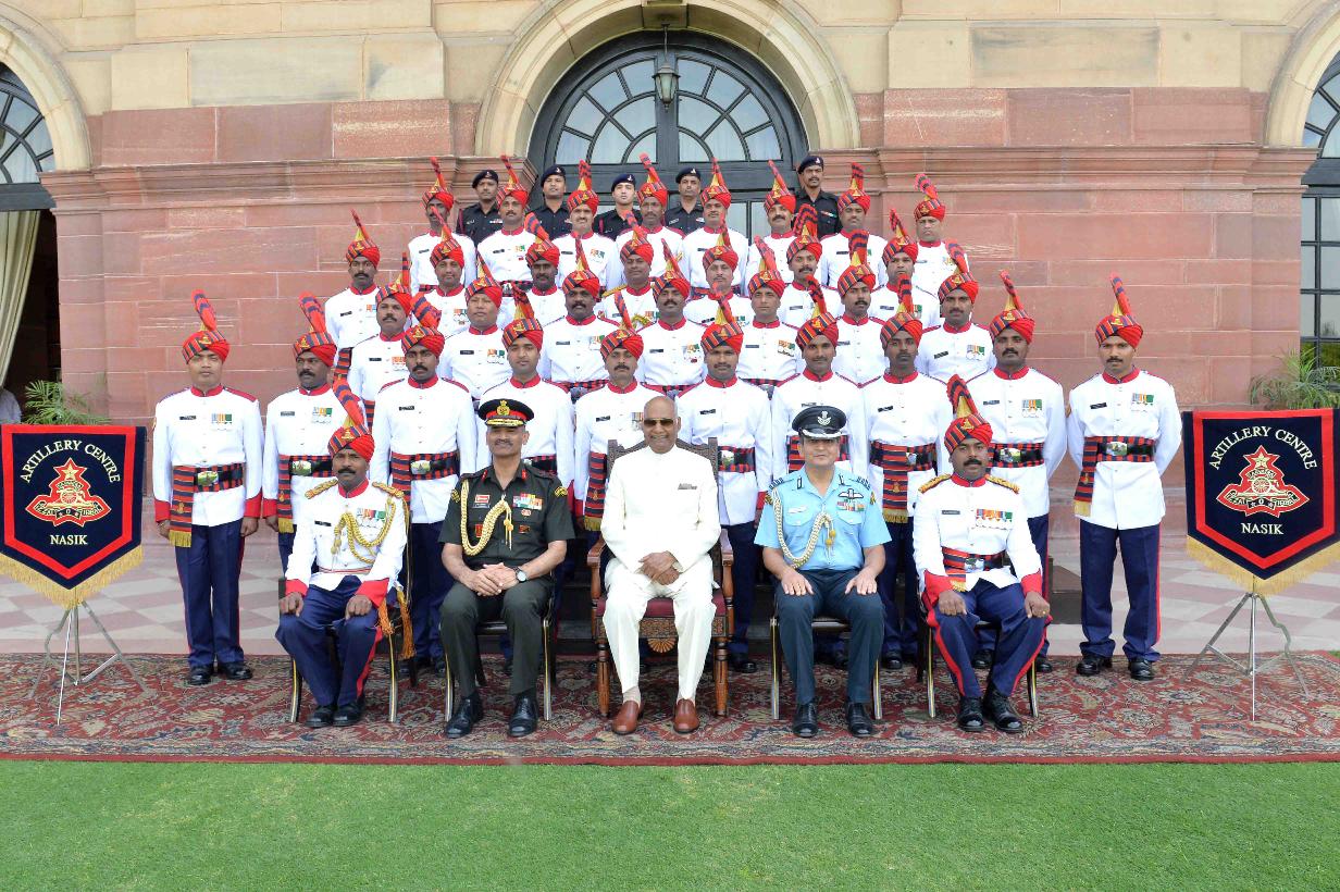 | Caption: | The President of India, Shri Ram Nath Kovind with the Military Band of the Artillery Centre, Nasik Road Camp, at Rashtrapati Bhavan on March 28, 2018. |
