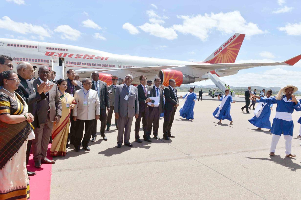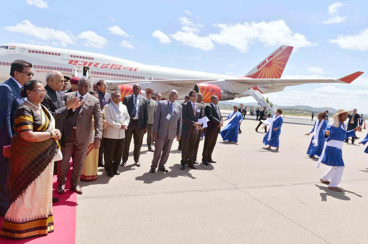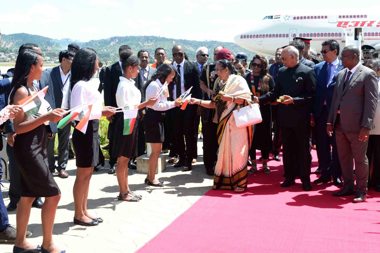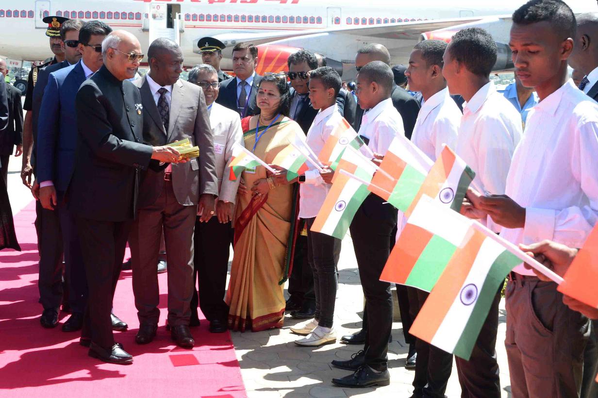 | Caption: | The President of India, Shri Ram Nath Kovind and the First Lady of India, Smt. Savita Kovind being received by the Prime Minister of Madagascar, H.E. Mr. Olivier Mahafaly Solonandrasana on their arrival, at Ivato International Airport, Antananarivo, in Madagascar on March 14, 2018. |