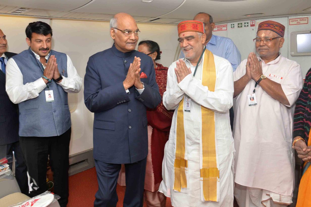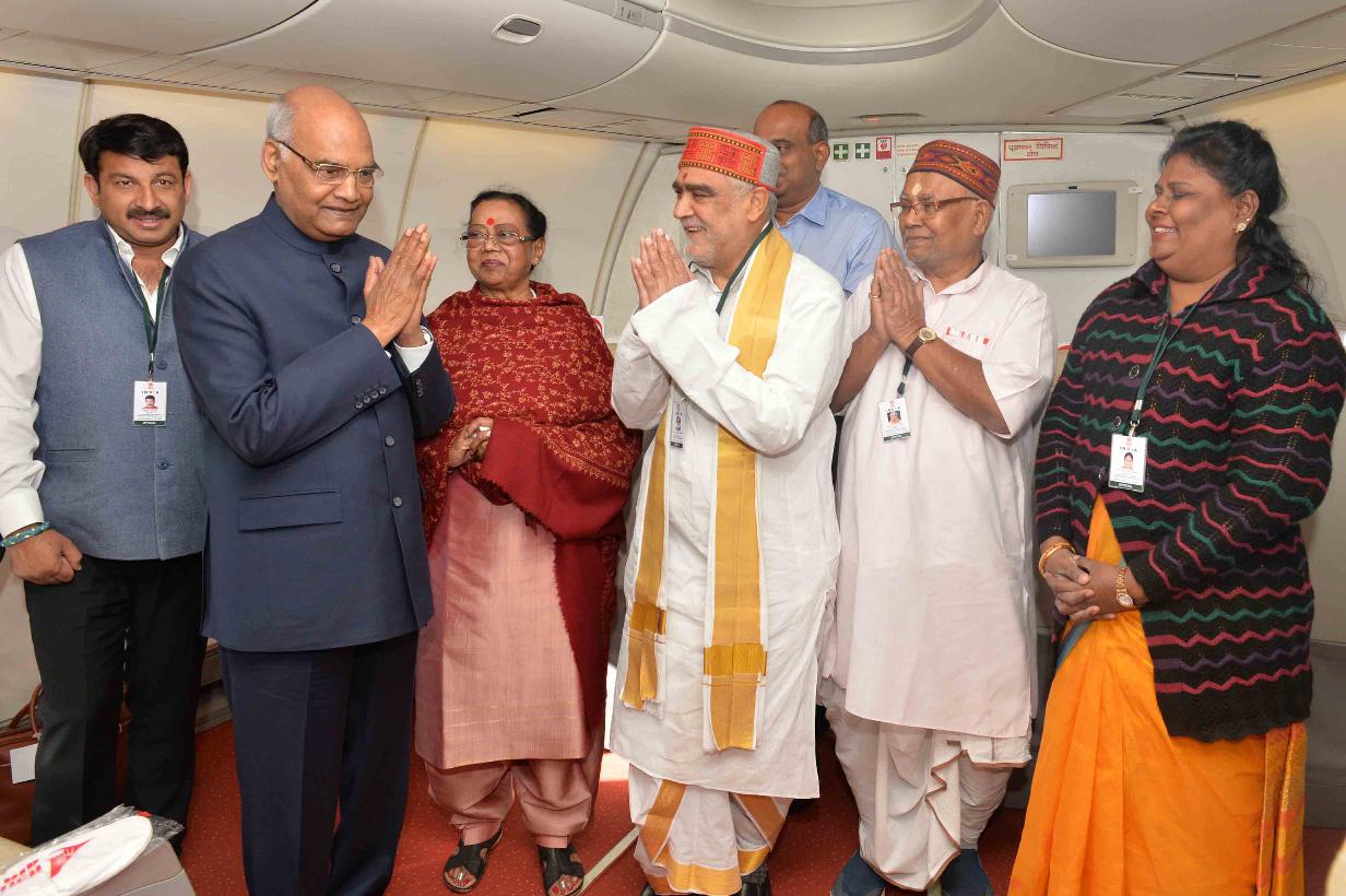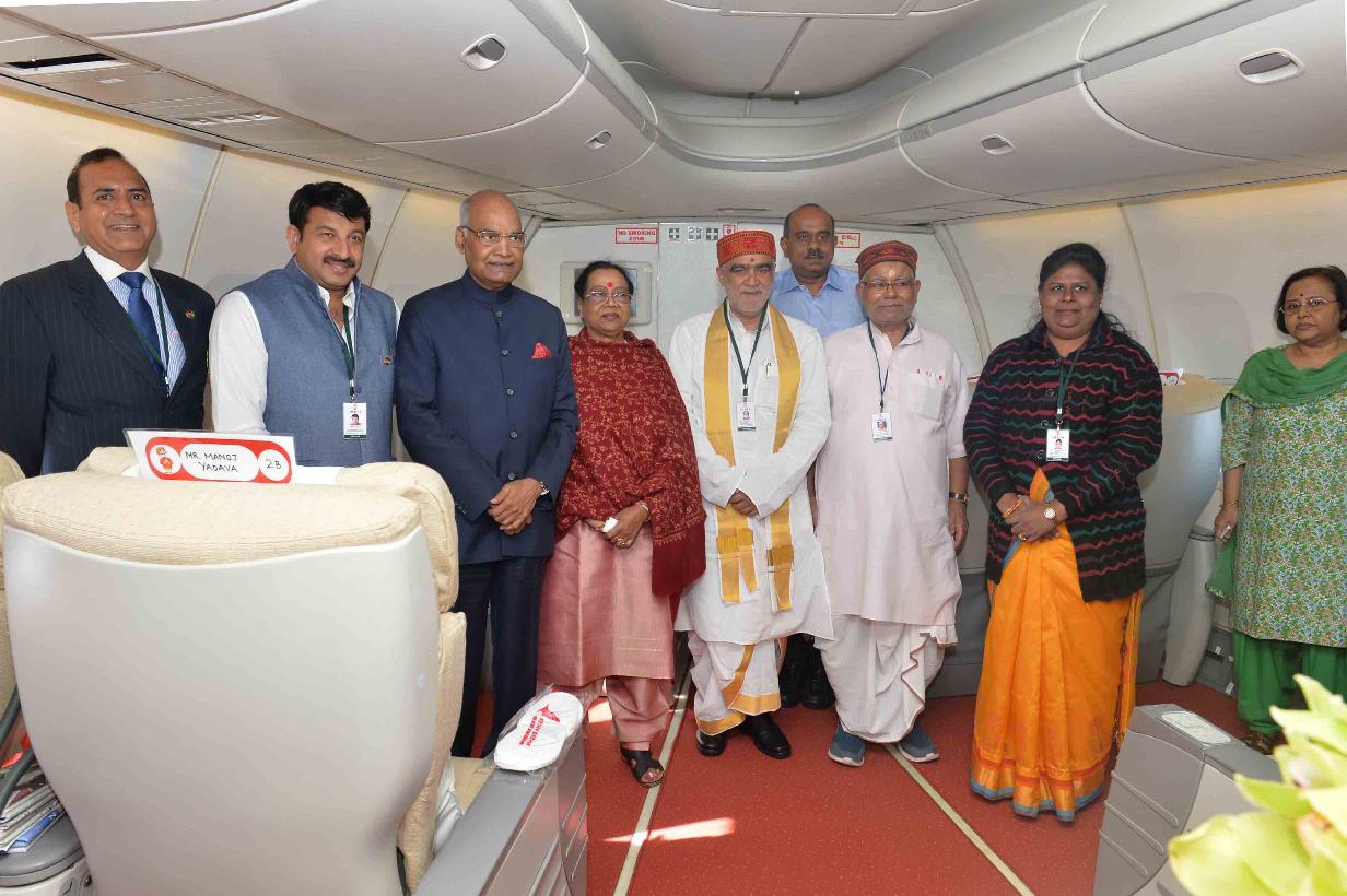 | Caption: | The President of India, Shri Ram Nath Kovind and the First Lady of India, Smt. Savita Kovind along with official delegation, the Minister of State for Health and Family Wefare, Shri Ashwini Kumar Choubey, the Member of Parliament (RS), Smt. Vijila Satyanath, the Members of Parliament (LS), Shri Hukum Dev Narayan, Shri Manoj Tiwari and Shri R. Radhakrishnan, onboard during their way to Republic of Mauritius at Air India Boeing 747-400 on March 11, 2018. |