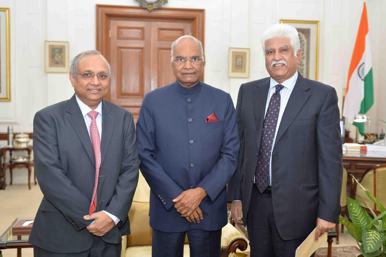 | Caption: | Shri Rakesh Bharti Mittal, President and Shri Chandrajit Banerjee, Director General, Confedration of Indian Industry (CII) meeting with the President of India, Shri Ram Nath Kovind, at Rashtrapati Bhavan on May 03, 2018. |