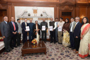 | Caption: | Shri Kamlesh D. Patel, President, Shri Ram Chandra Mission, Shri Joshua D. Pollock with others presented a copy of the book 'The Heartfulness Way' to the President of India, Shri Ram Nath Kovind, at Rashtrapati Bhavan on January 18, 2018. |