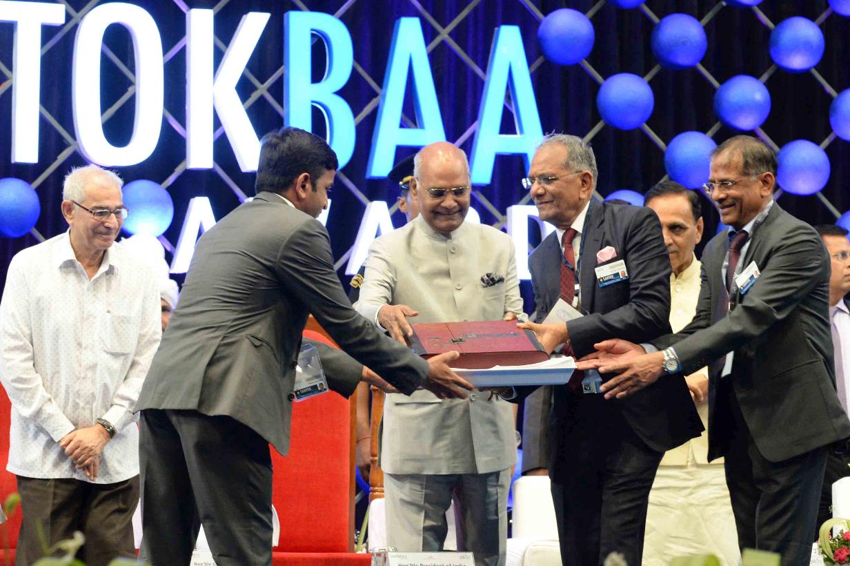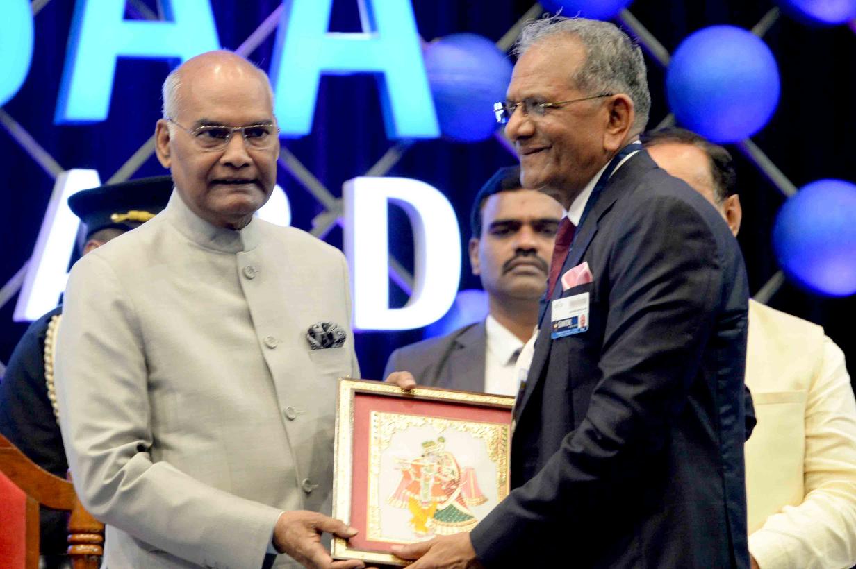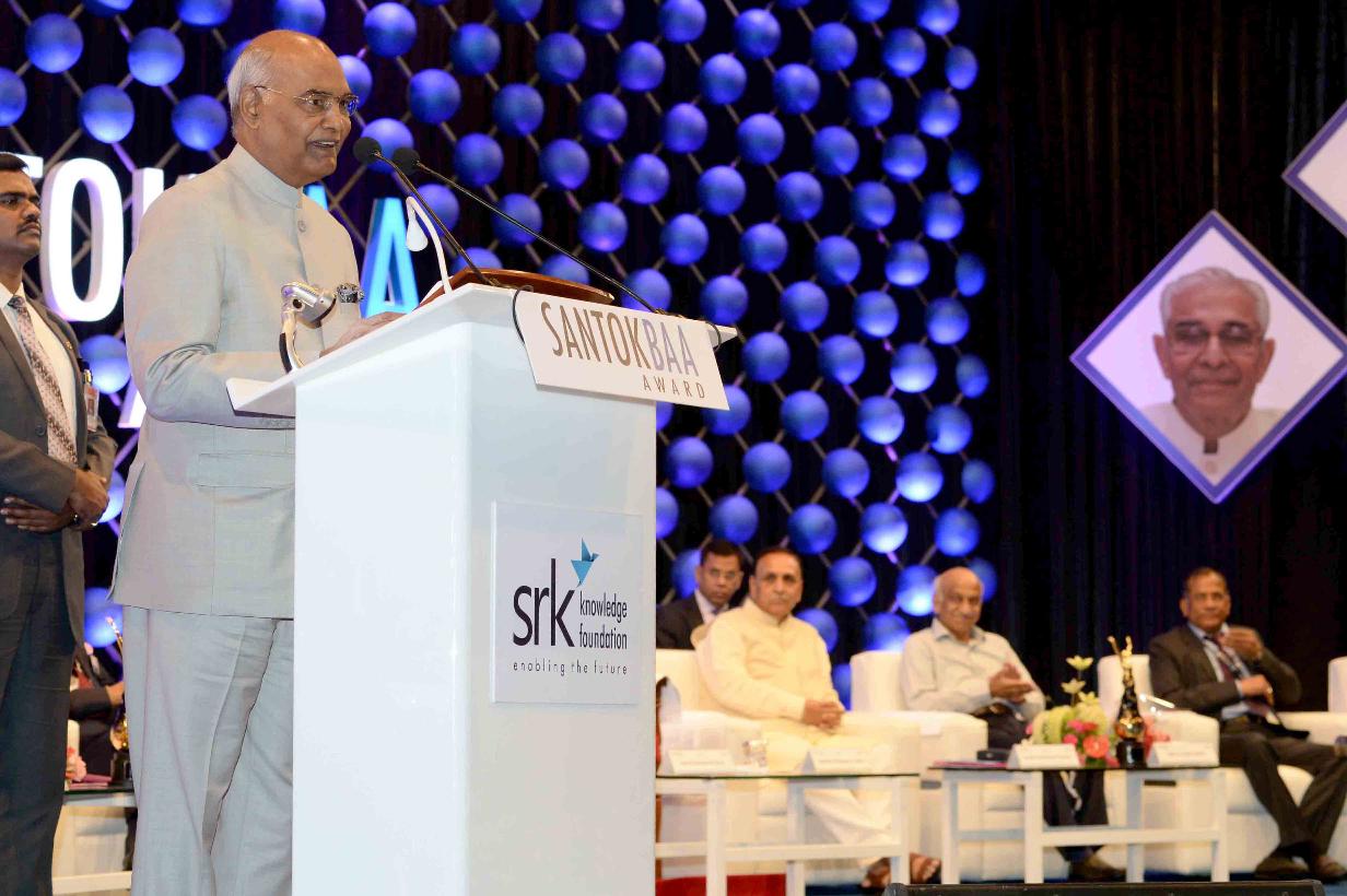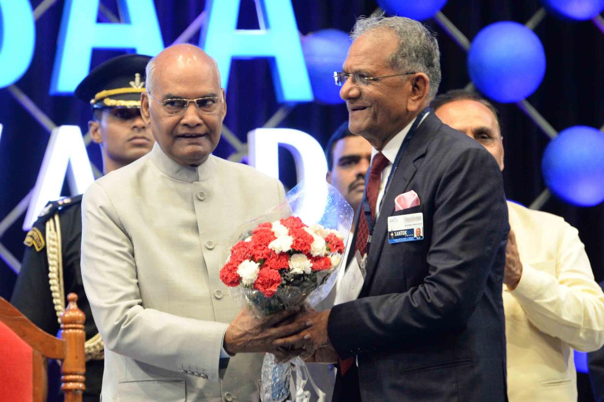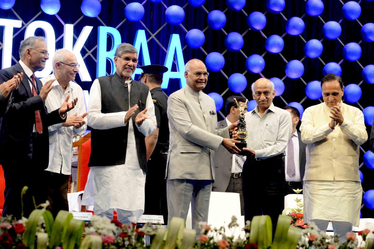| Caption: | The President of India, Shri Ram Nath Kovind presenting the 'Santokbaa Humanitarian Award' to Dr. Kiran Kumar, former Chairman, ISRO and Shri Kailash Satyarthi, Nobel Laureate, at Surat, in Gujarat on May 29, 2018. |