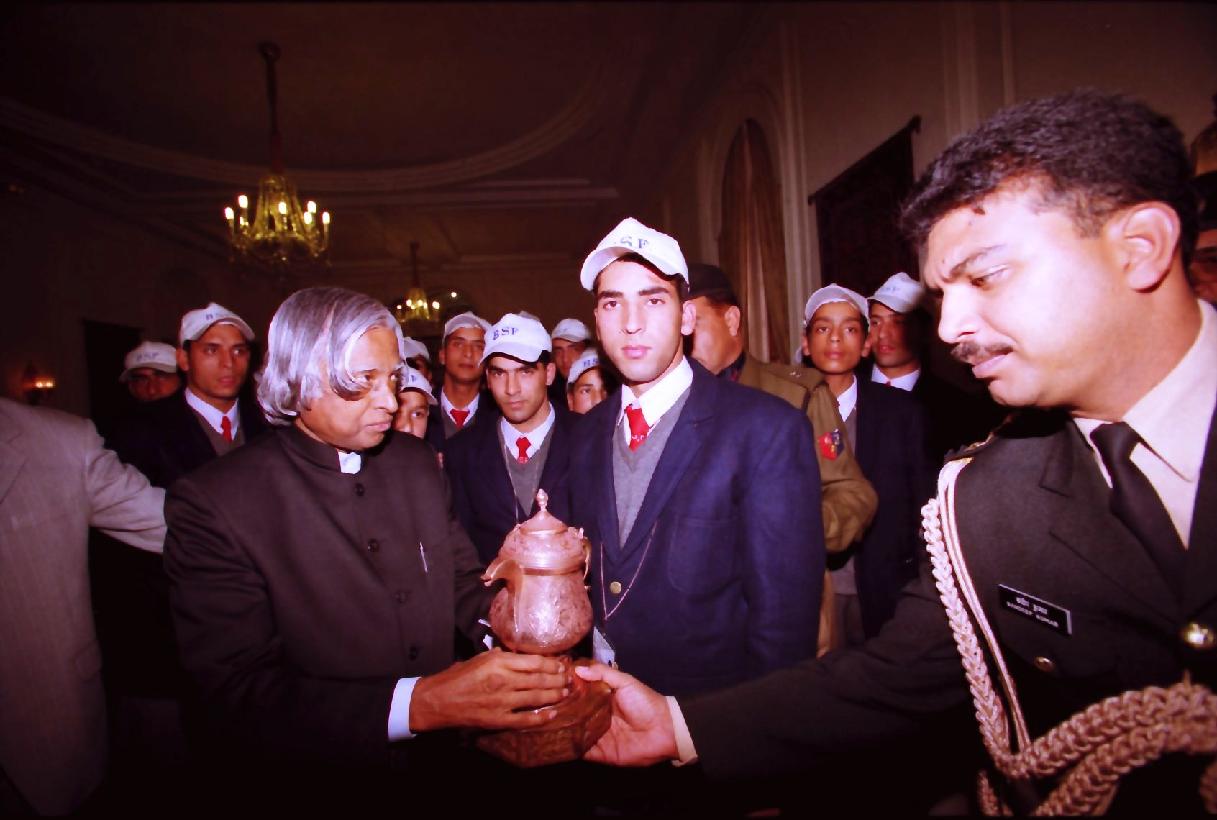 | Caption: | The Students from Various Schools of Jammu and Kashmir with the Officials of Border Security Force calling on the President of India, Dr A P J Abdul Kalam at the Yellow Drawing Room of Rashtrapati Bhavan in New Delhi on Jan 27, 2003 |