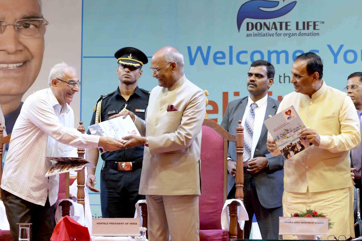 | Caption: | The Governor of Gujarat, Shri O. P. Kohli releasing the Donate Life Book and presenting the first copy to the President of India, Shri Ram Nath Kovind, at the felicitation function of Cadaver Organ Donor Family Members, at Surat, in Gujarat on May 29, 2018. |