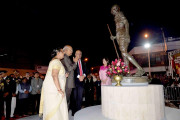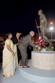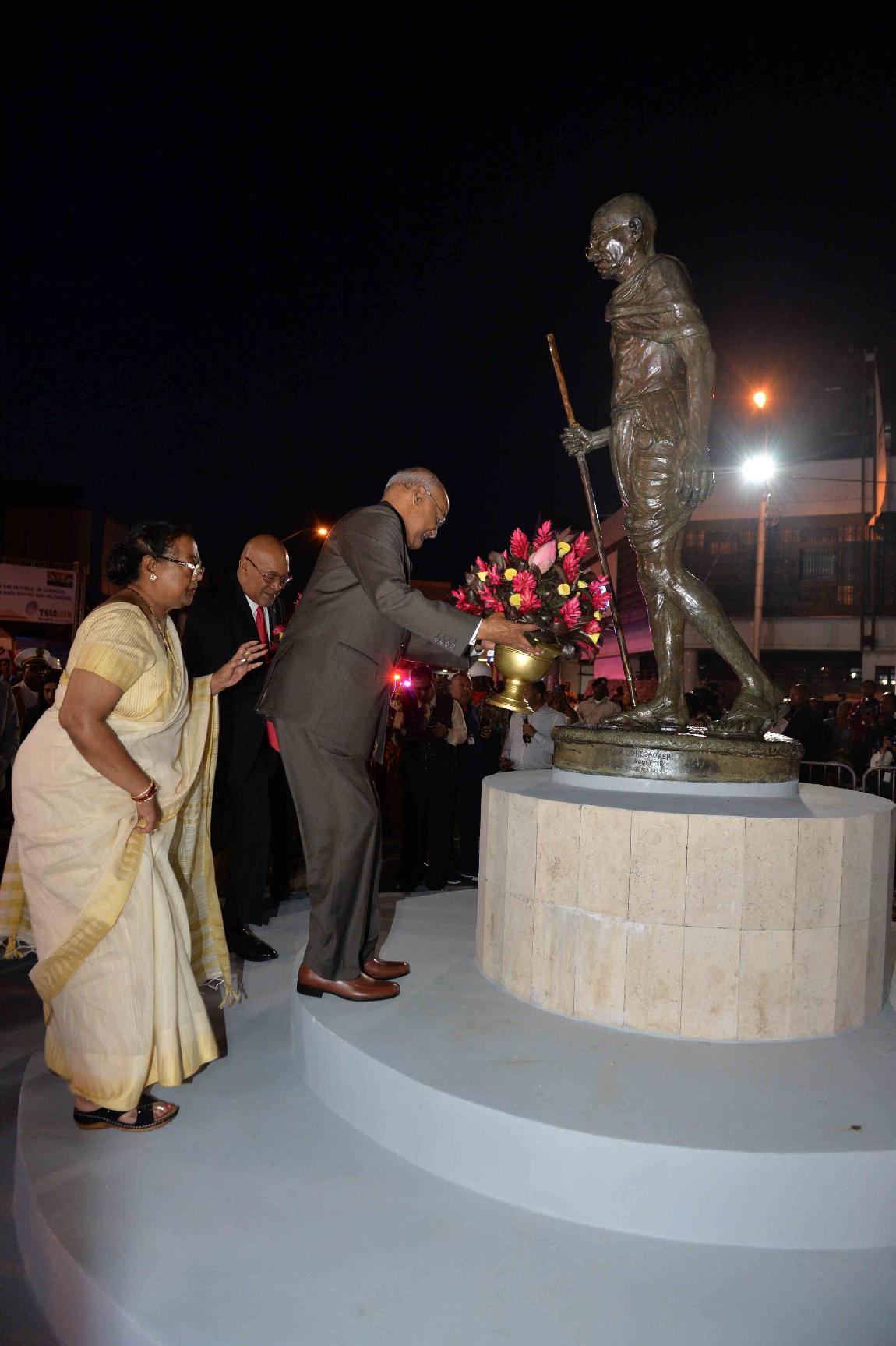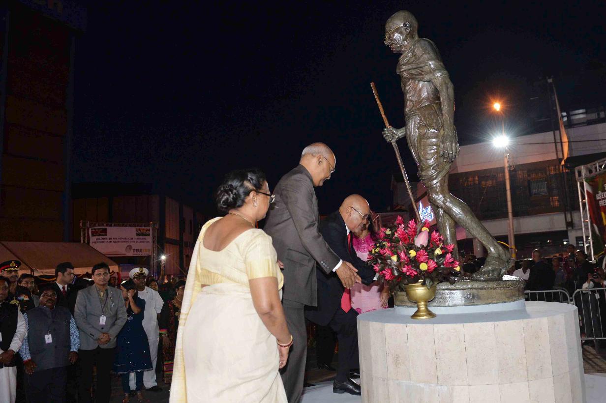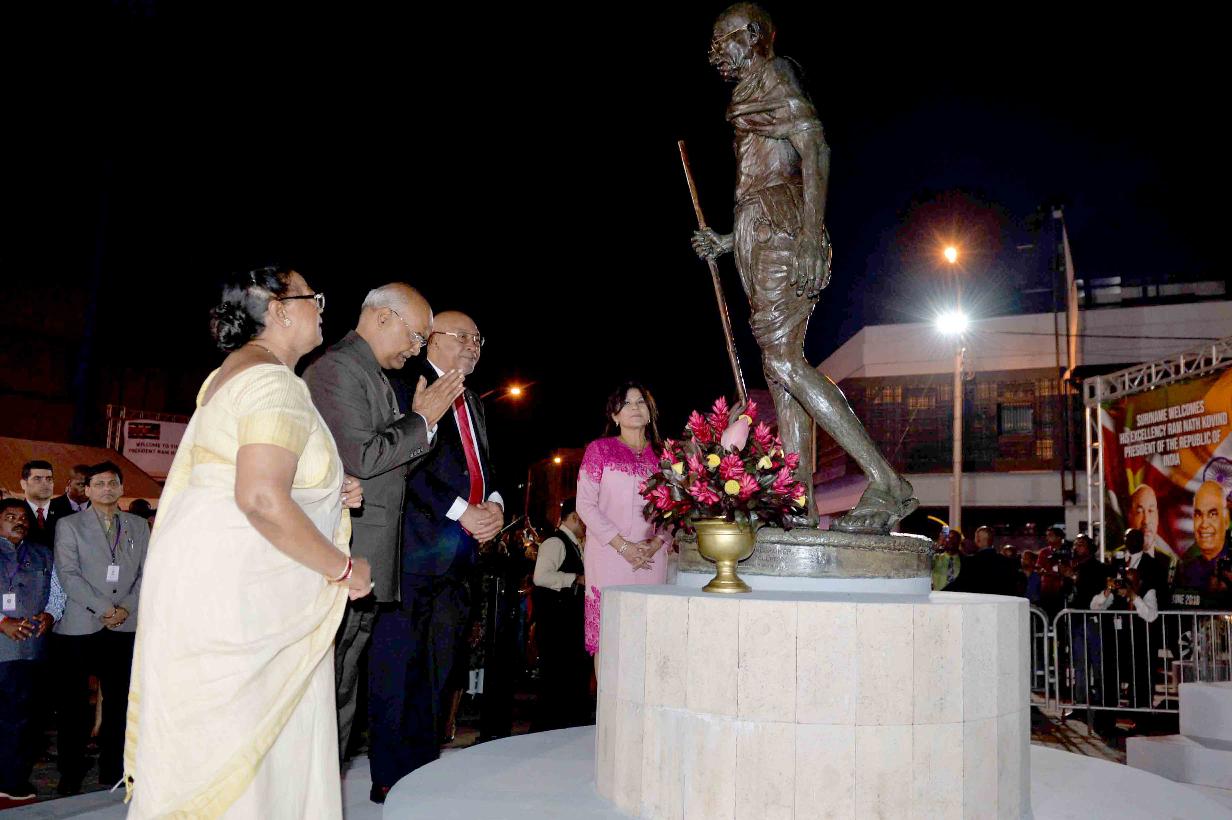 | Caption: | The President of India, Shri Ram Nath Kovind and the First Lady of India, Smt. Savita Kovind along with the President of the Republic of Suriname, H.E. Mr. Desire Delano Bouterse and the First Lady of Suriname, Mrs. Ingrid Bouterse-Waldring paying floral tributes at the Statue of Mahatma Gandhi, in Suriname on June 19, 2018. |
