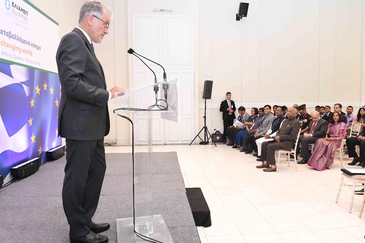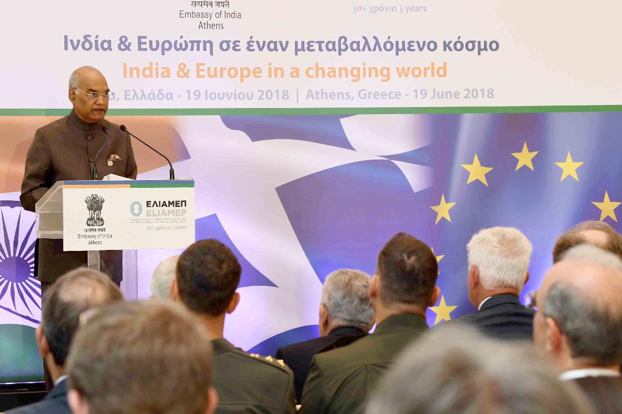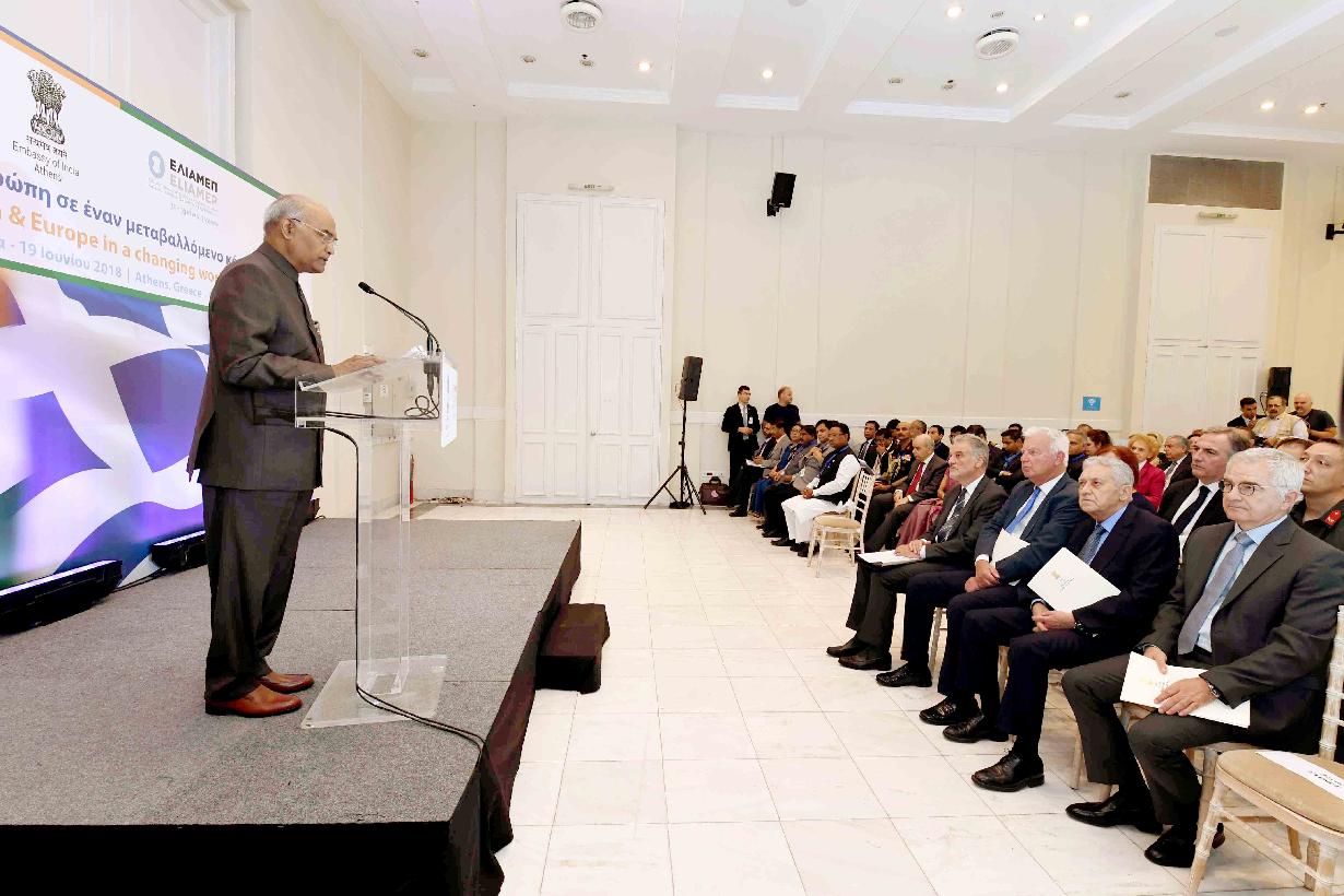 | Caption: | The President of India, Shri Ram Nath Kovind addressing the diplomats, policymakers and academics on the subject "India and Europe in a Changing World , during a event, organised by the Hellenic Foundation for European and Foreign Policy (ELIAMEP), at Athens, in Greece on June 19, 2018. |