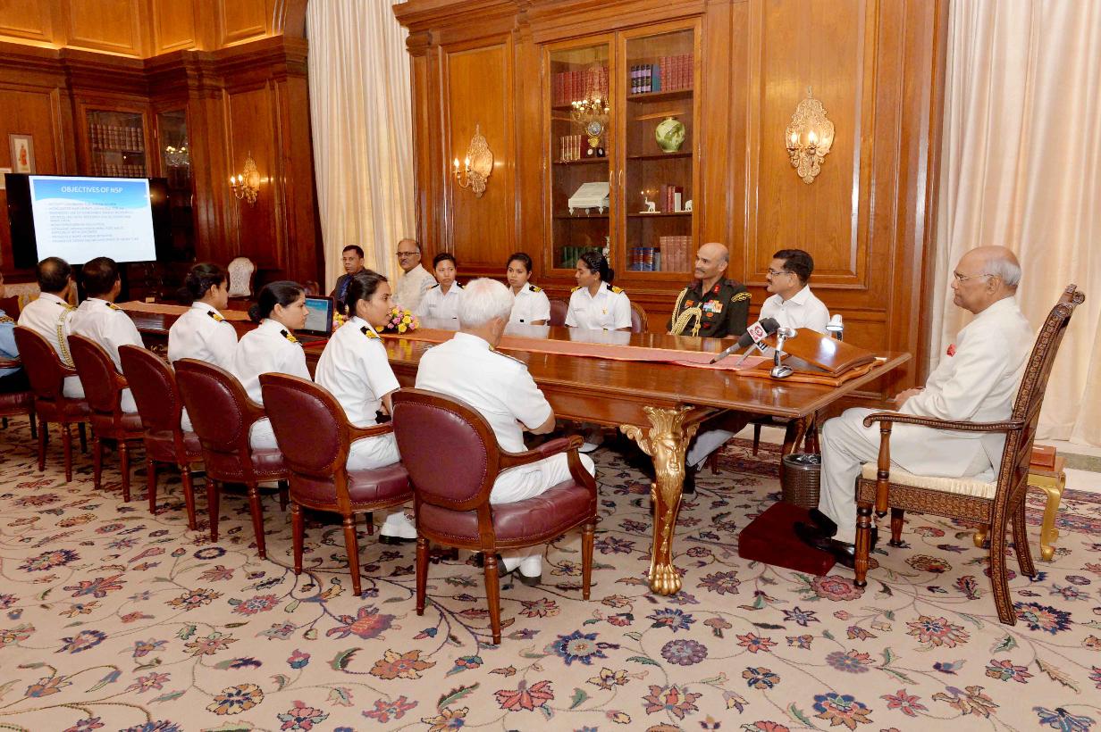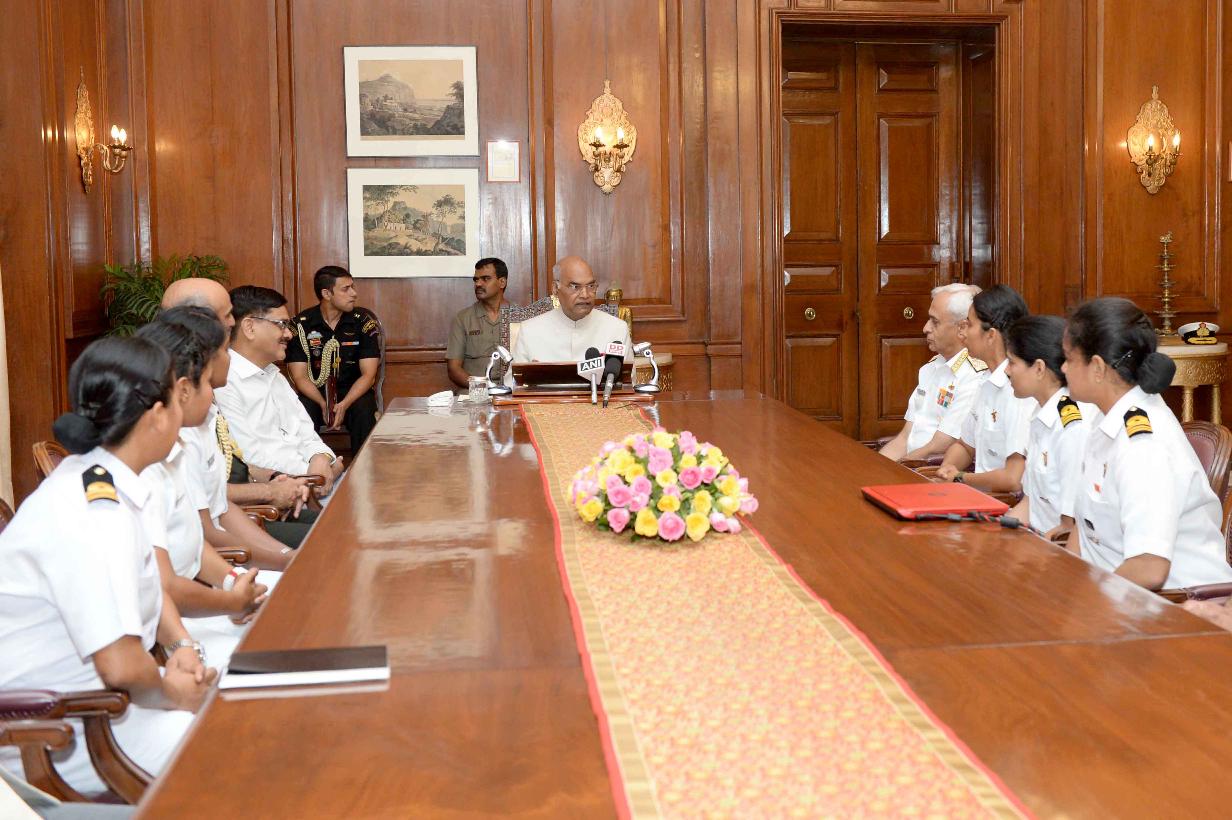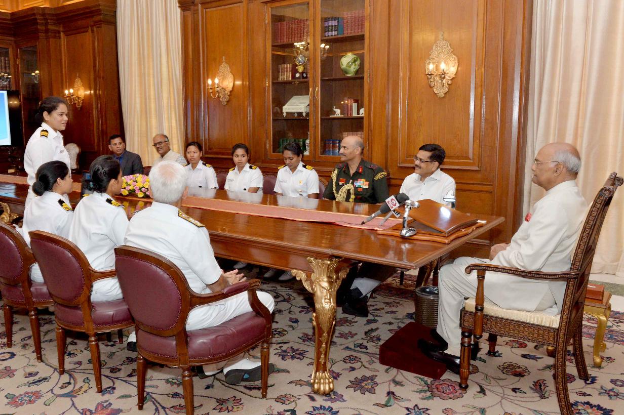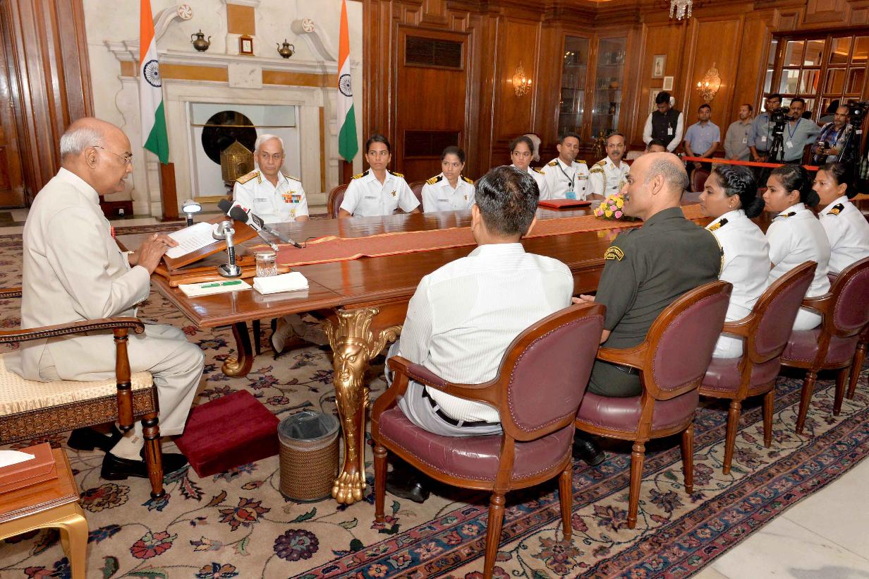 | Caption: | The President of India, Shri Ram Nath Kovind interacting with the all-women crew of INSV Tarini on completion of their voyage of circumnavigation of the globe, at Rashtrapati Bhavan on June 01, 2018. |