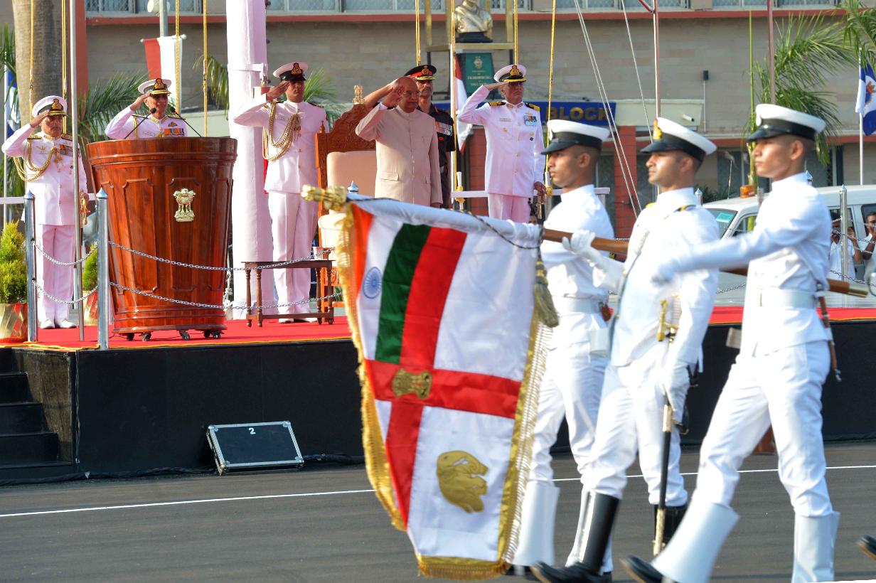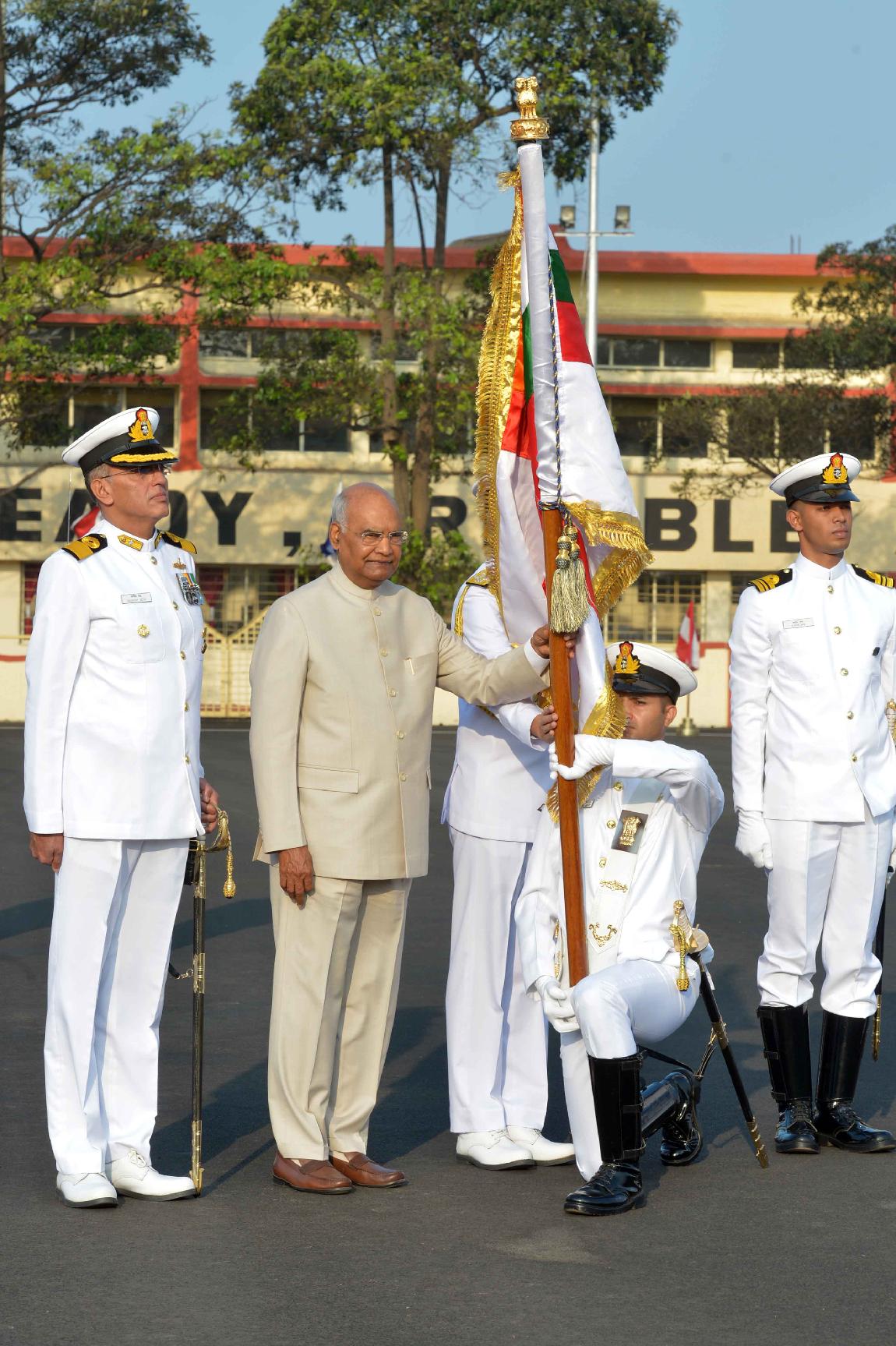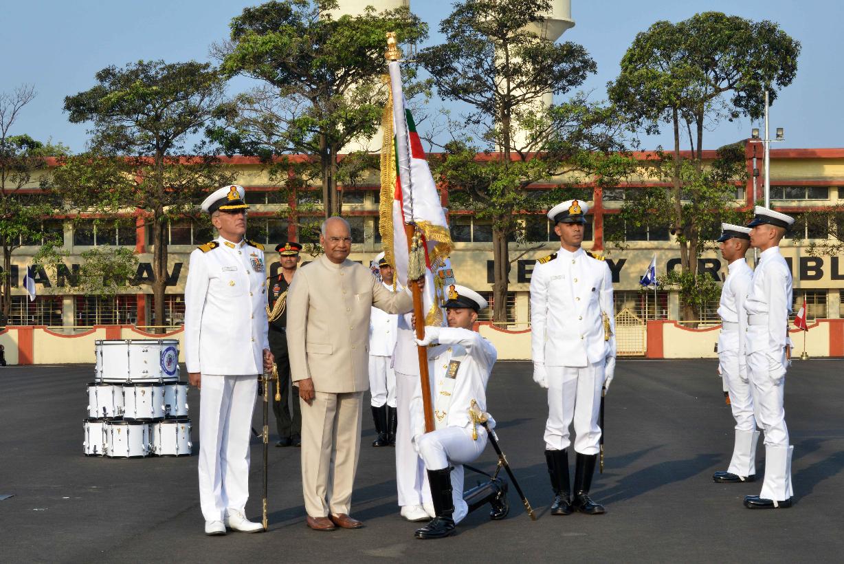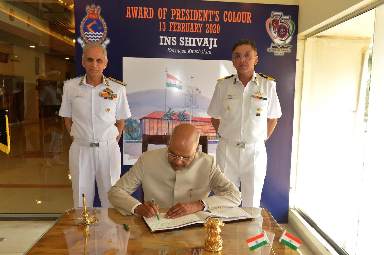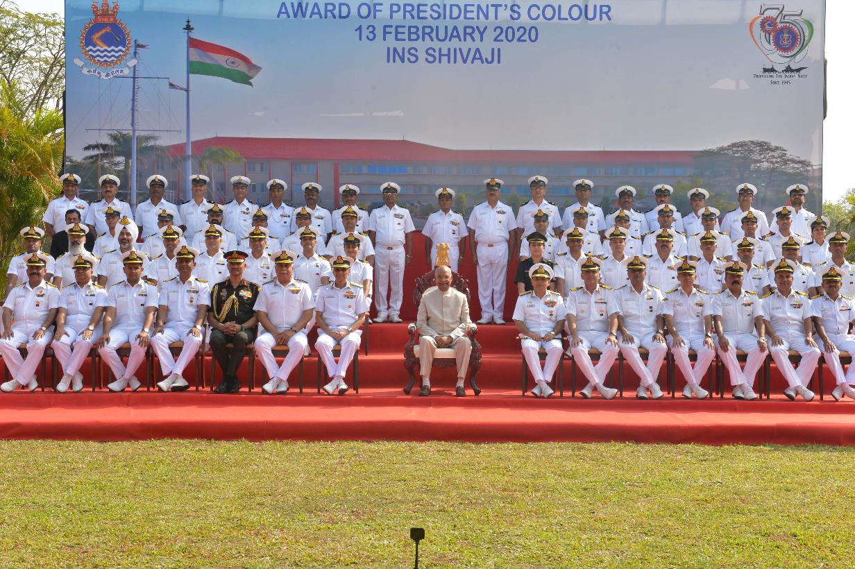 | Caption: | The President of India, Shri Ram Nath Kovind presents colour to INS Shivaji, at Lonavala, in Maharashtra on February 13, 2020. |