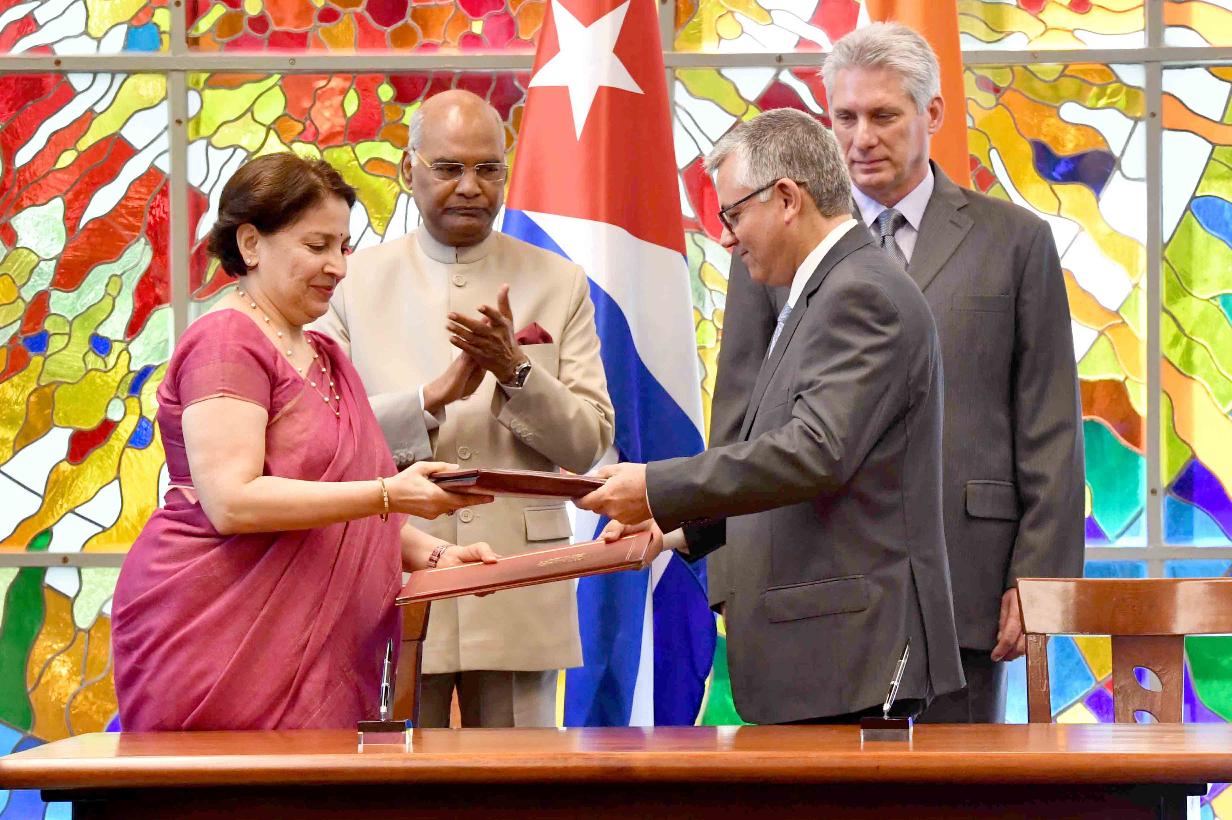 | Caption: | The President of India, Shri Ram Nath Kovind and the President of Cuba, H.E. Mr. Miguel Diaz-Canel witnessing the various signing of agreements between India and Cuba, at Revolution Palace, in Cuba on June 22, 2018. |