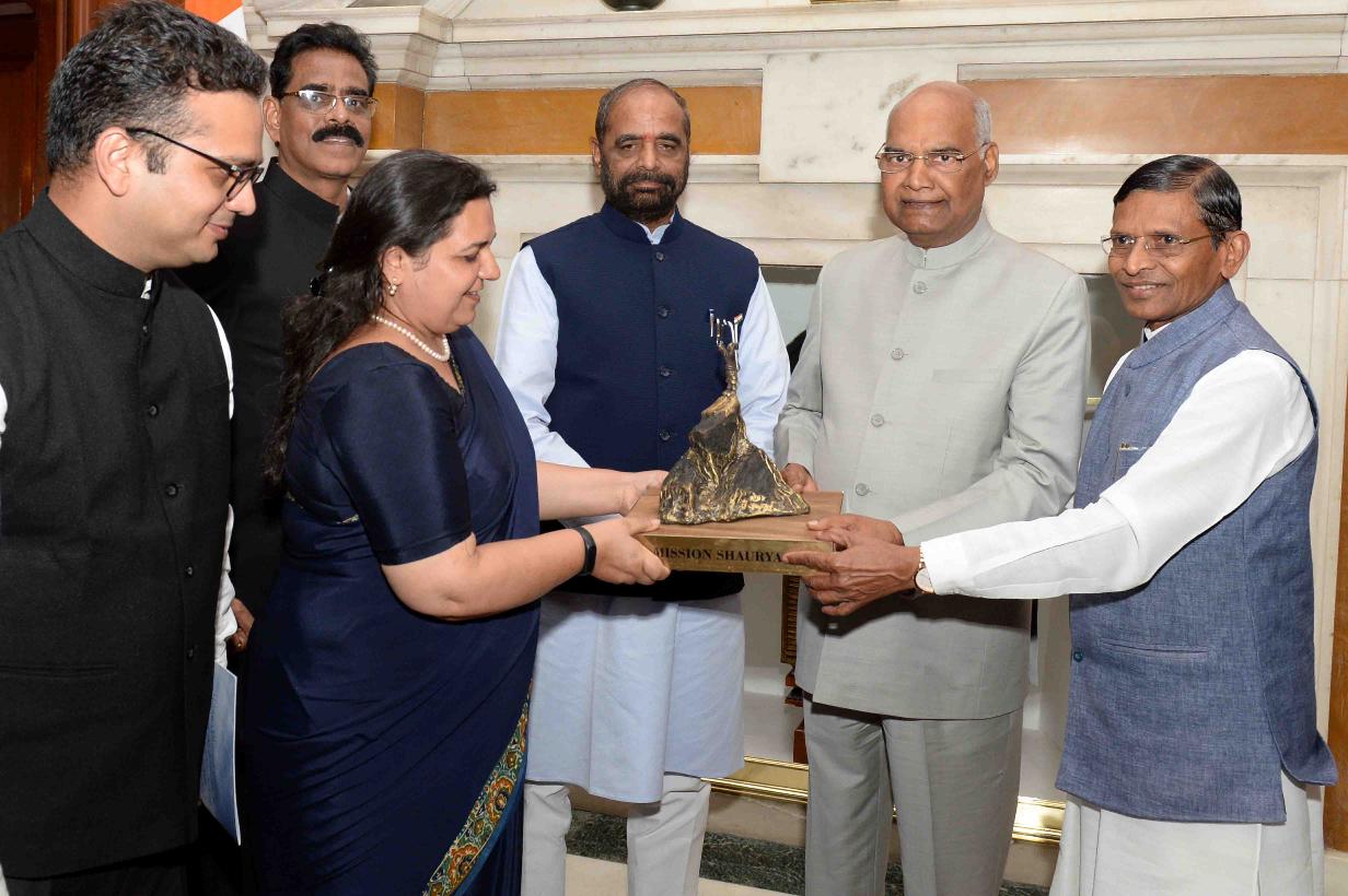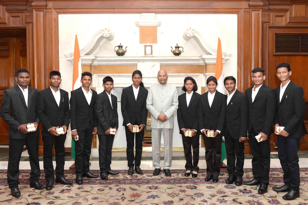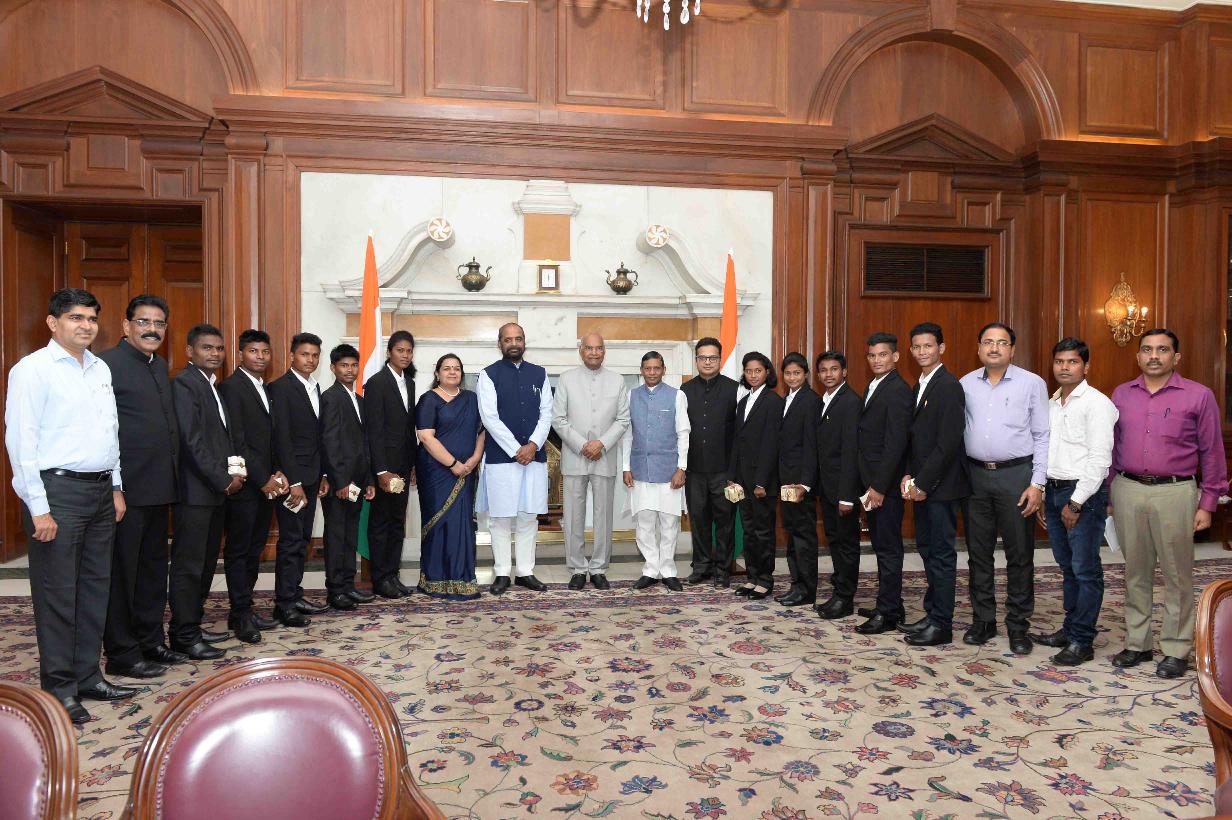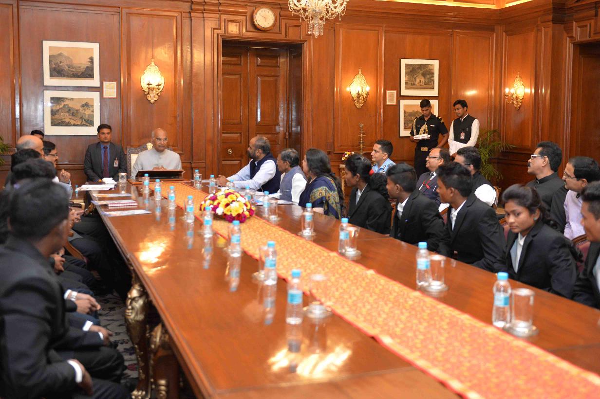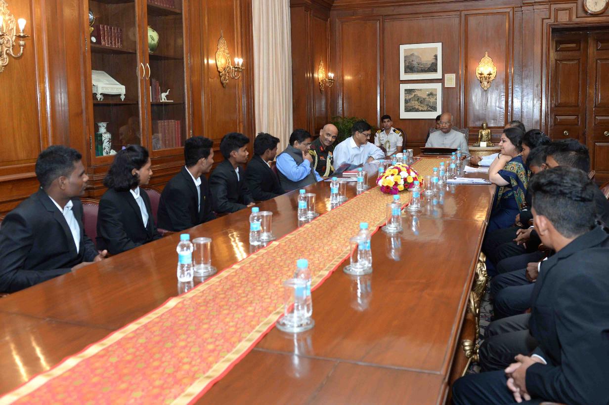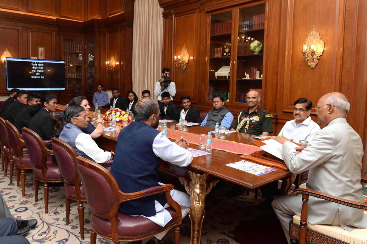 | Caption: | The President of India, Shri Ram Nath Kovind meeting with the students of tribal residential schools of Chandrapur, Maharashtra who participated in 'Mission Shaurya' to scale Mount Everest, at Rashtrapati Bhavan on June 27, 2018. All these children dreamed big and trained hard five of them successfully scaled the summit. |