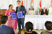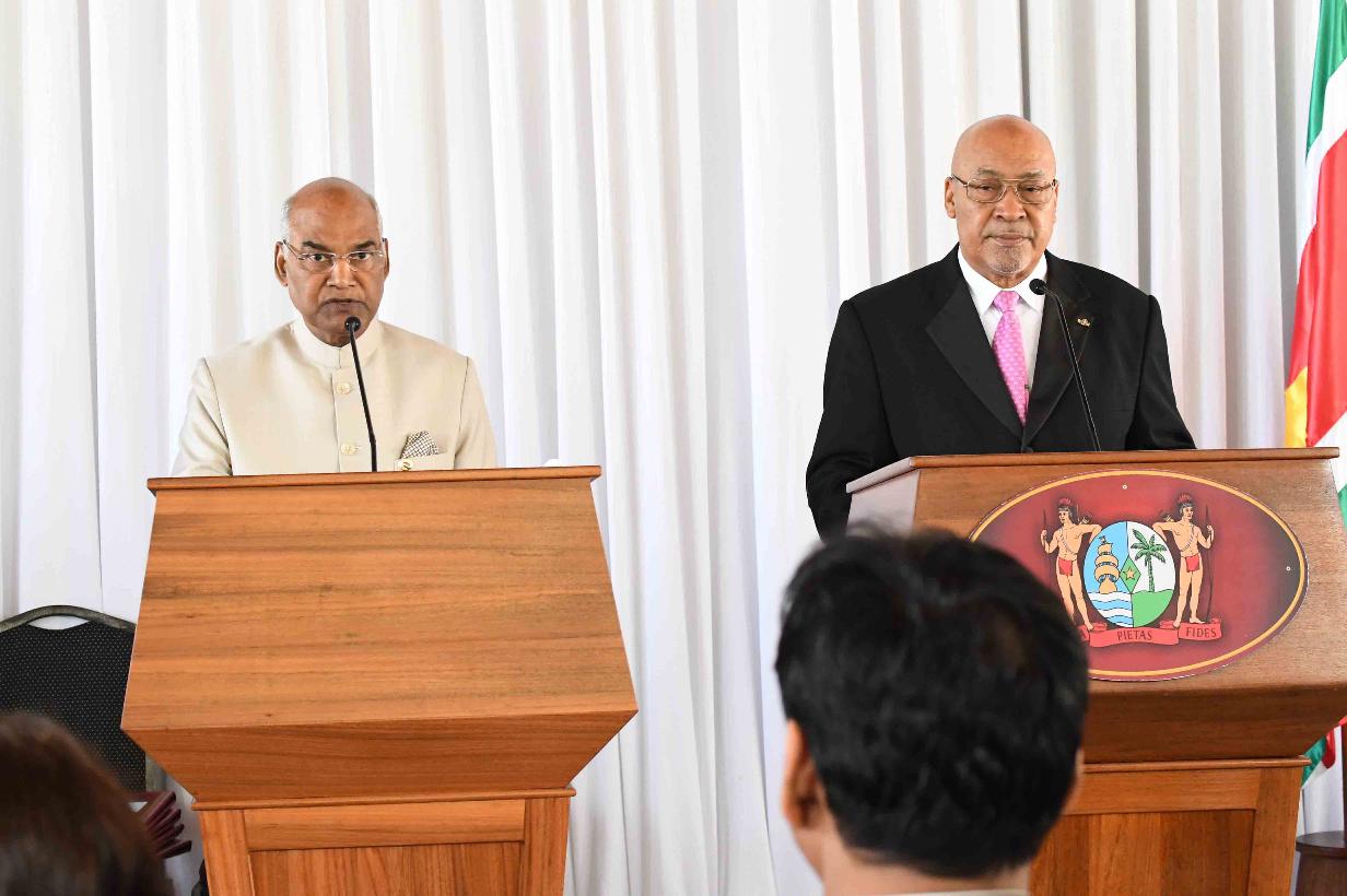| Caption: | The President of India, Shri Ram Nath Kovind and the President of the Republic of Suriname, H.E. Mr. Desire Delano Bouterse witnessing the exchange of documents of Various Agreements between India and Suriname and delivering Press Statements, at Presidential Palace, in Suriname on June 20, 2018. |