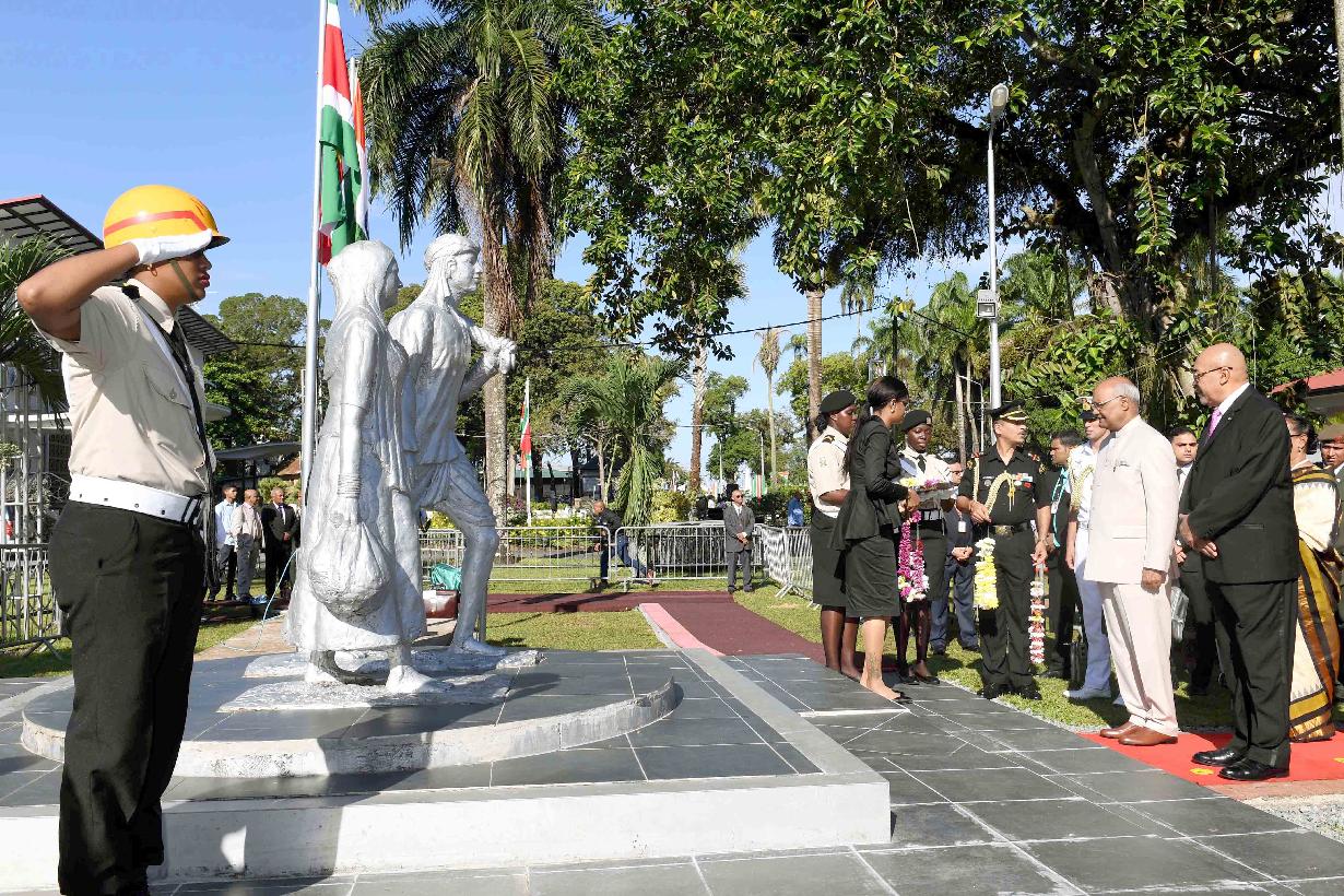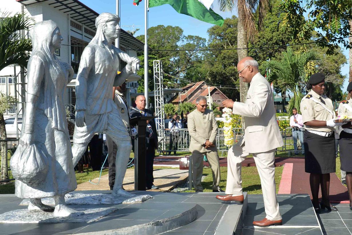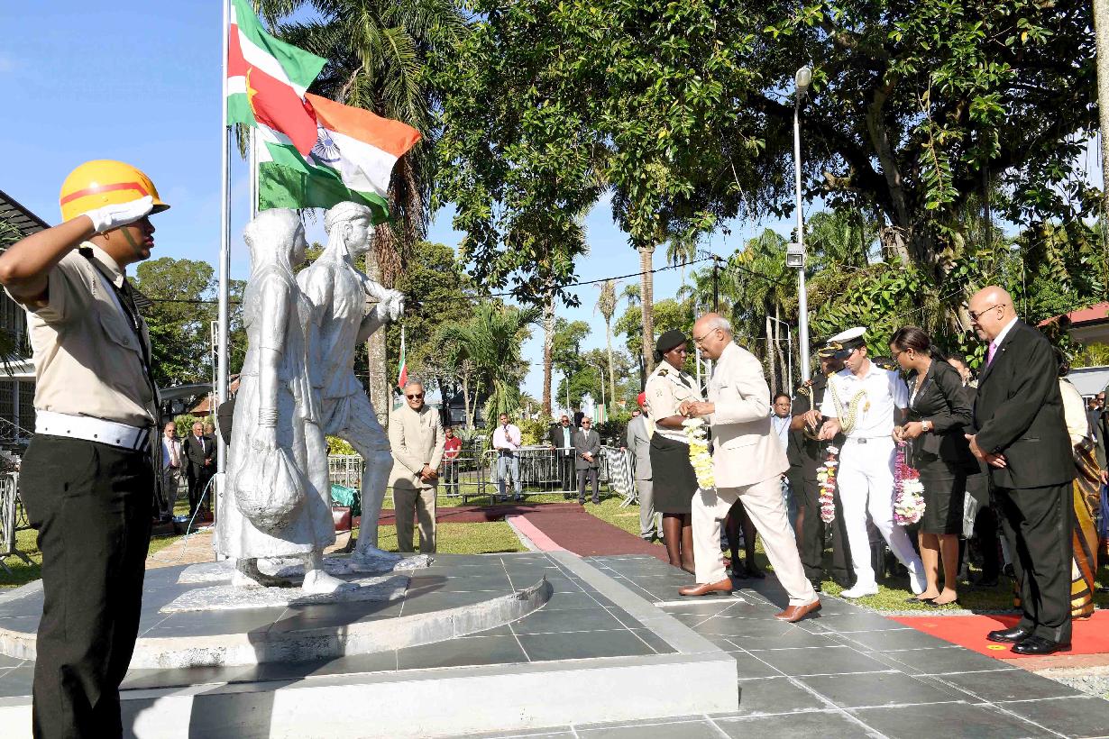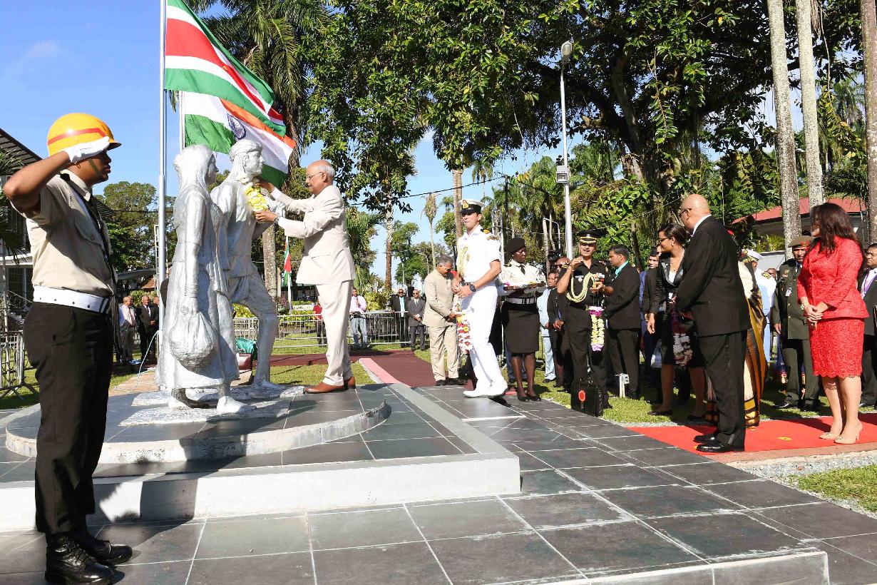 | Caption: | The President of India, Shri Ram Nath Kovind garlanding the Statues of Baba and Mai (the symbolic memorial of the arrival of Indian immigrants in Suriname in 1873), in Suriname on June 20, 2018. |