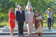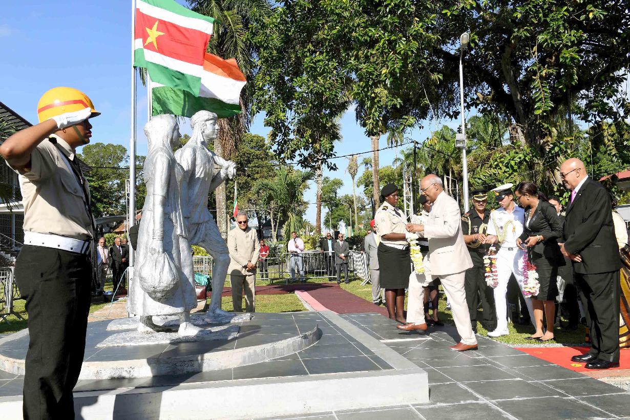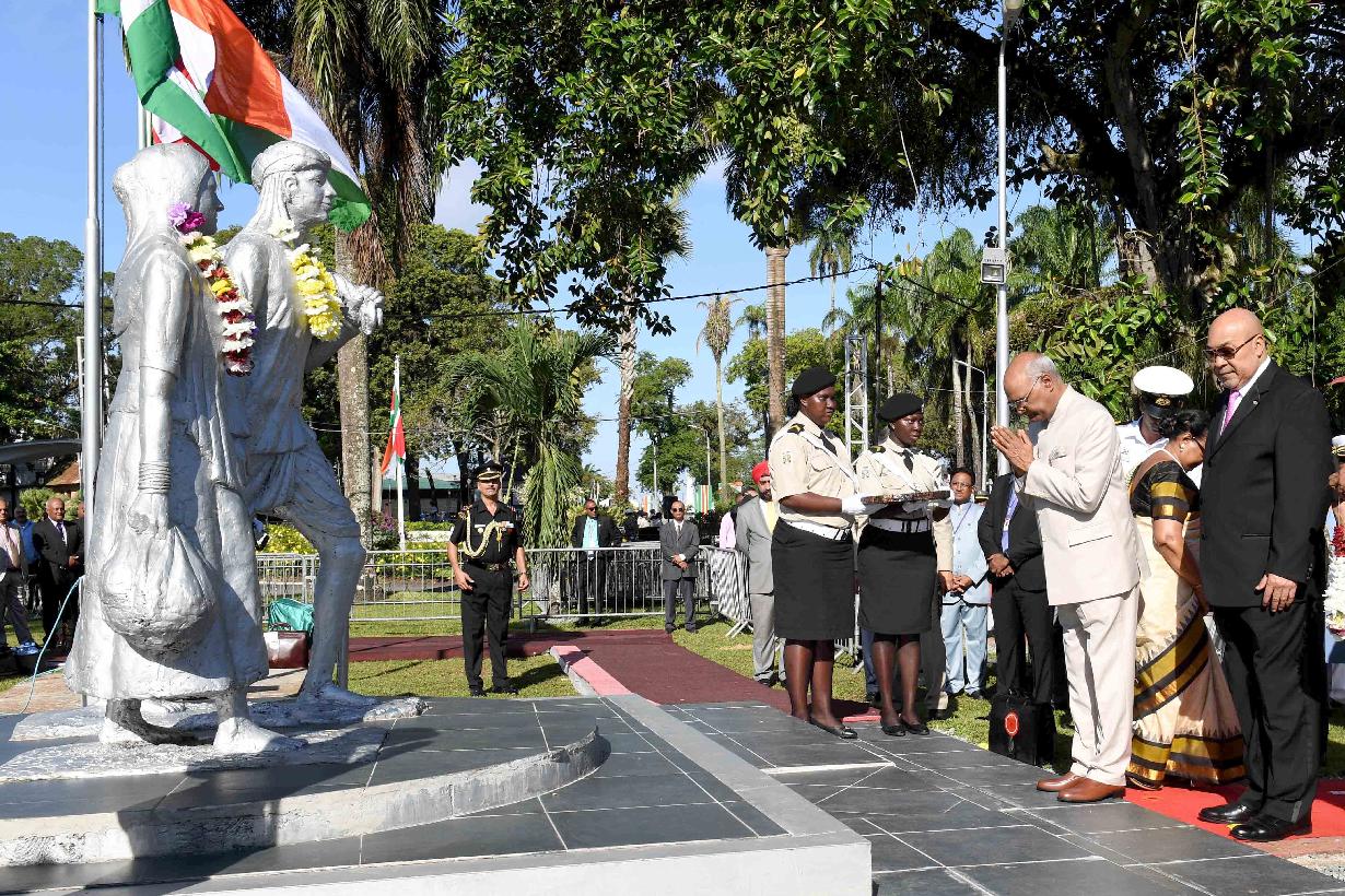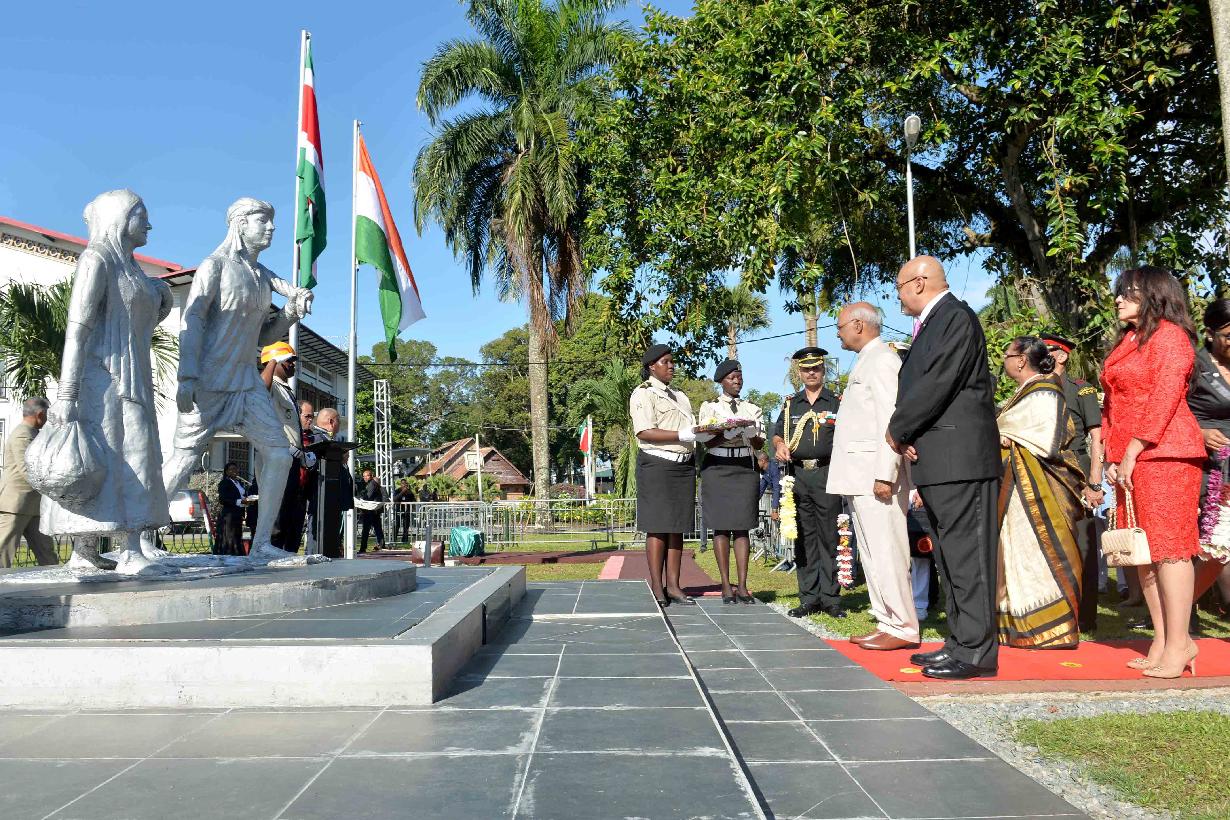 | Caption: | The President of India, Shri Ram Nath Kovind garlanding the Statues of Baba and Mai (the symbolic memorial of the arrival of Indian immigrants in Suriname in 1873), in Suriname on June 20, 2018. |