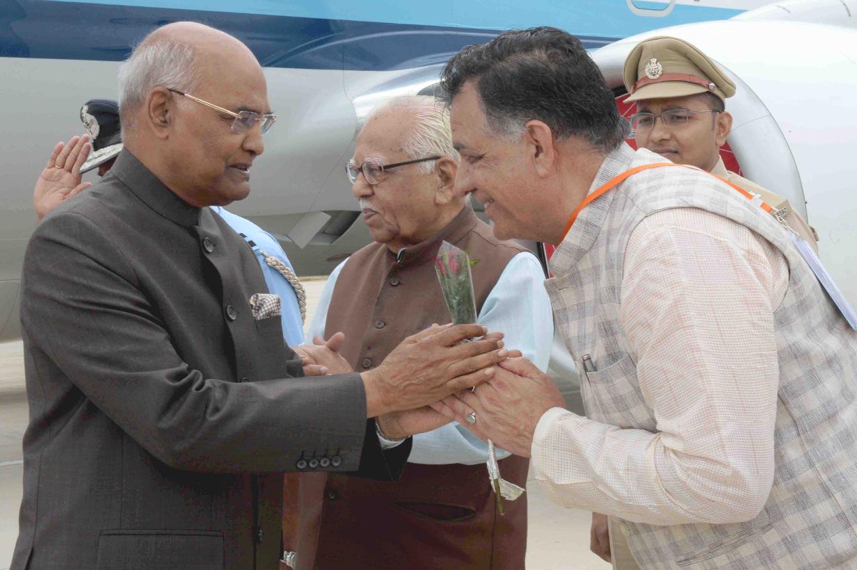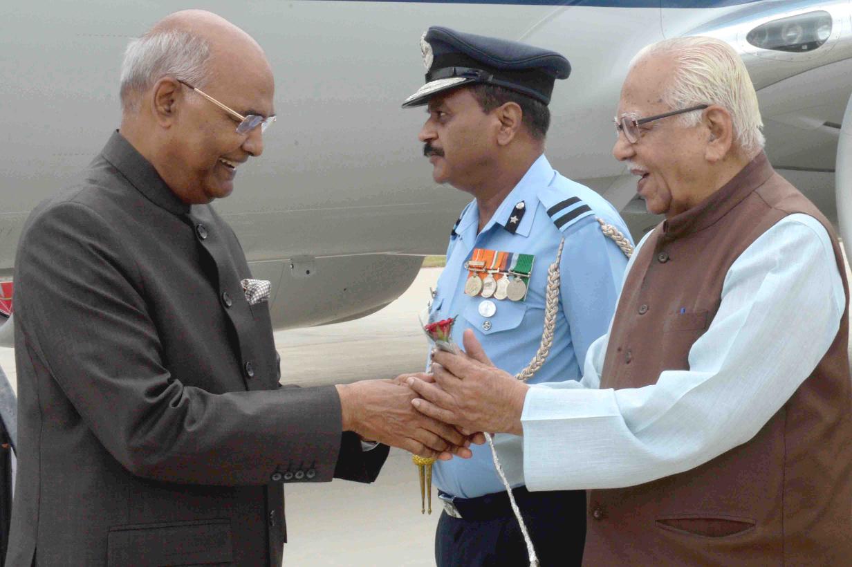 | Caption: | The President of India, Shri Ram Nath Kovind being received by the Governor of Uttar Pradesh, Shri Ram Naik, at Kanpur airport on June 28, 2018. |
