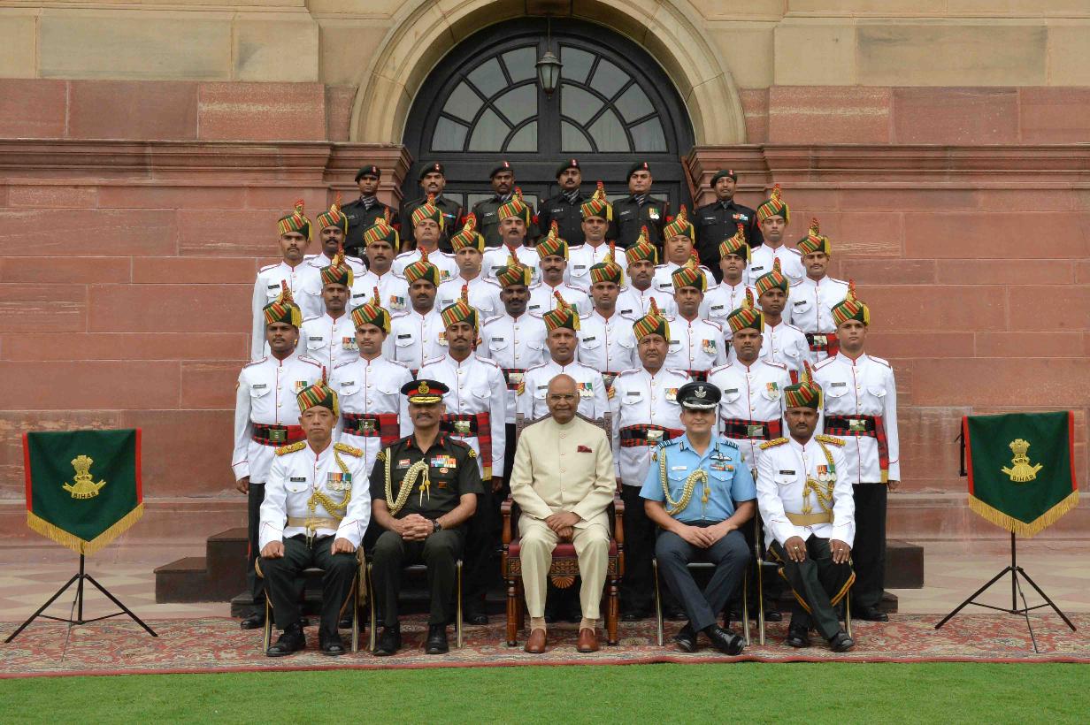 | Caption: | The President of India, Shri Ram Nath Kovind in a group photograph with the Military Band of the Bihar Regiment Centre, at Rashtrapati Bhavan on June 26, 2018. |