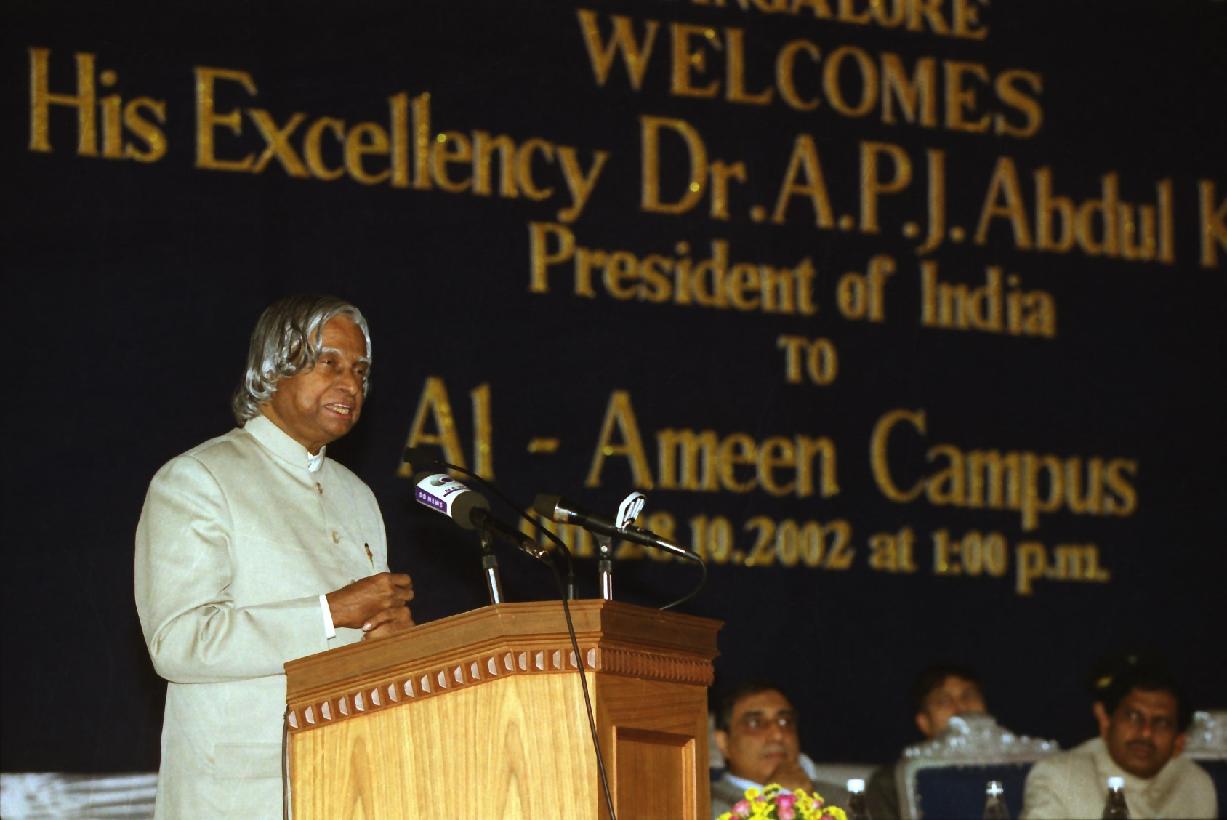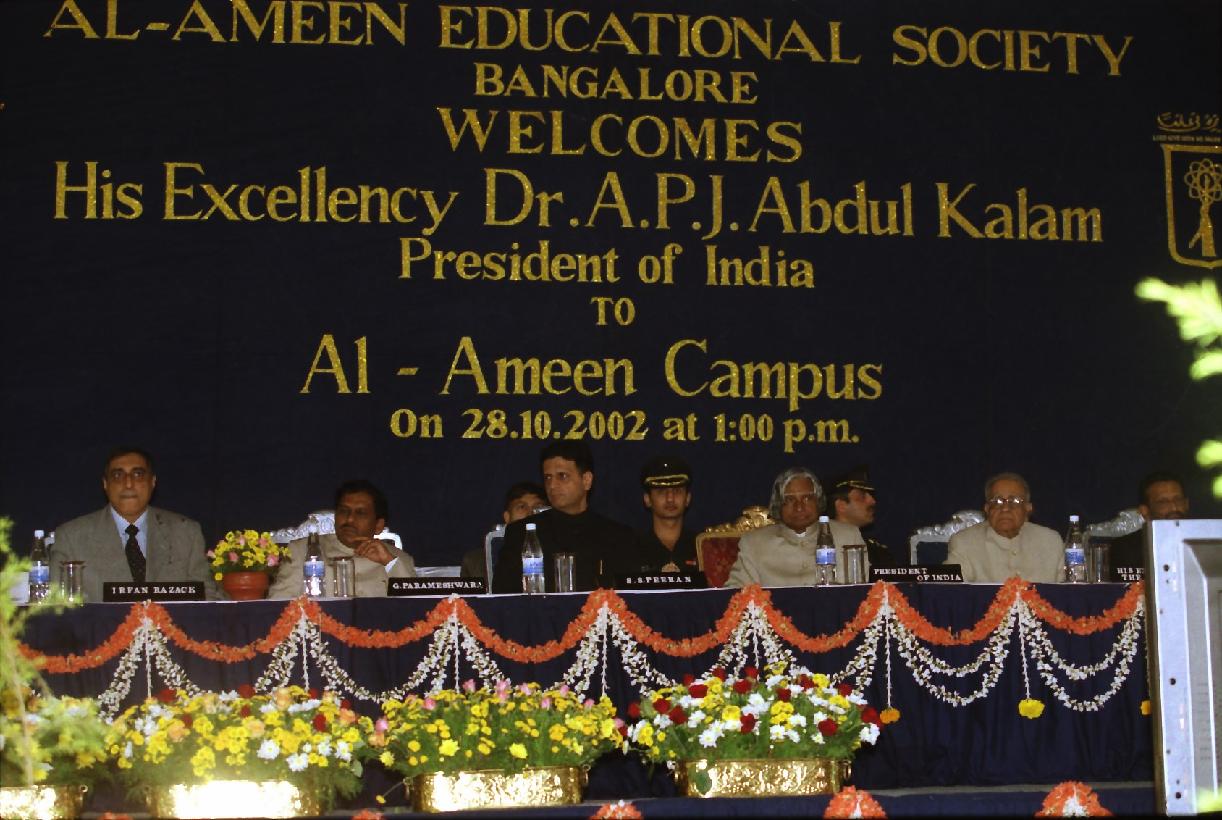 | Caption: | The President of India, Dr A P J Abdul Kalam interacting with the Students at Al-Ameen Educational Society at Bangalore in Karnataka on Oct 28, 2002 |
