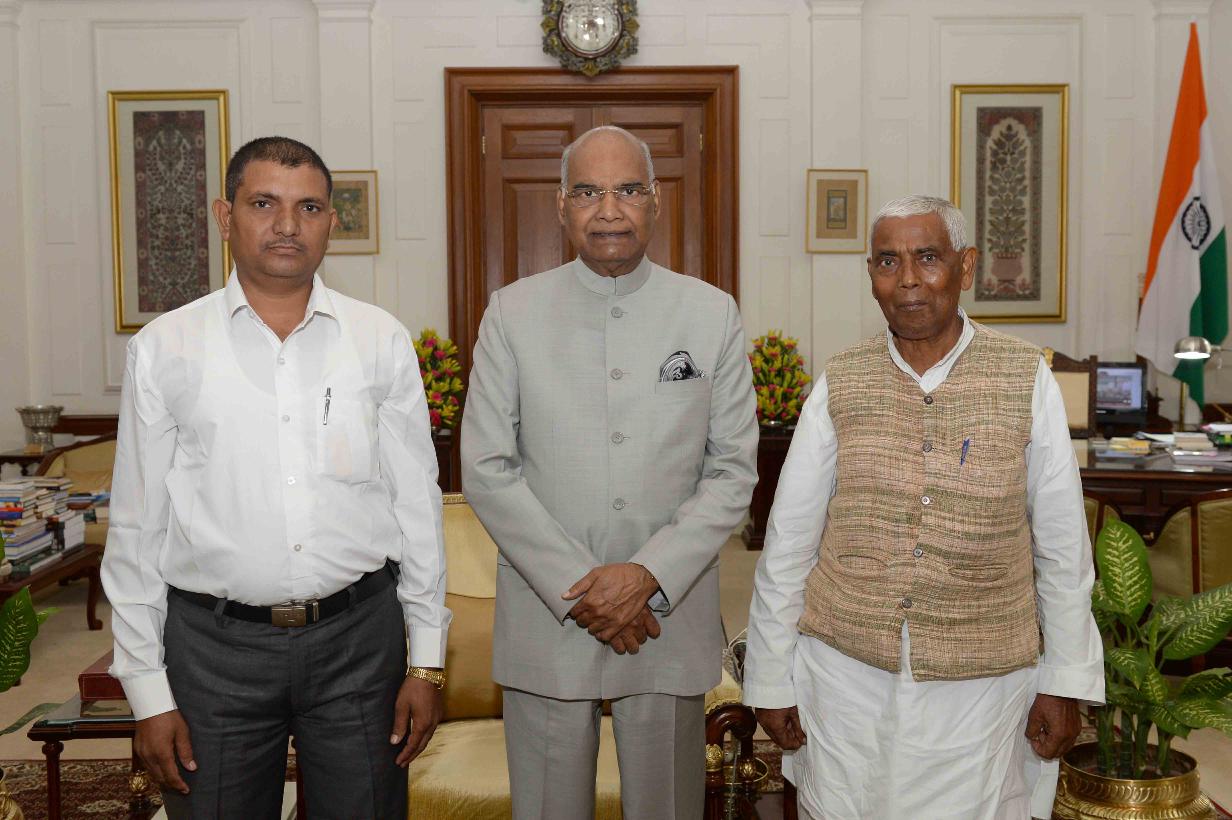 | Caption: | Shri Lalji Pal, Ex-Headmaster, Junior High School, Paronkh and Manager, Pragatishil Madhyamik Vidyalaya, Derapur, Kanpur Dehat along with his nephew Dr. Santosh Kumar meeting with the President of India, Shri Ram Nath Kovind, at Rashtrapati Bhavan on July 17, 2018. |