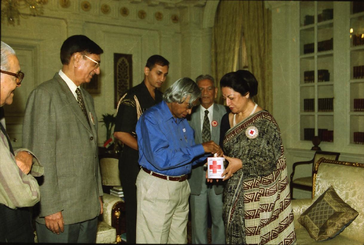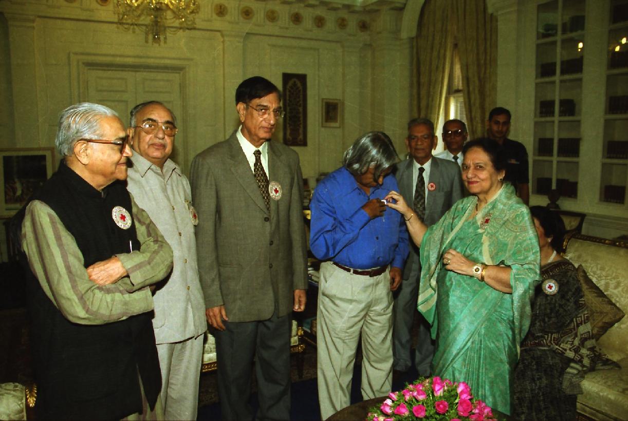 | Caption: | The President of India, Dr A P J Abdul Kalam with the Members of the Managing Body of Indian Red Cross Society, National Capital Territory Branch to pining a Flag on the occasion of their Flag Week at the Committee Room of Rashtrapati Bhavan in New Delhi on Nov 01, 2002 |