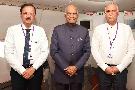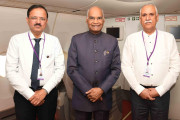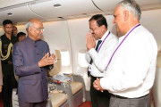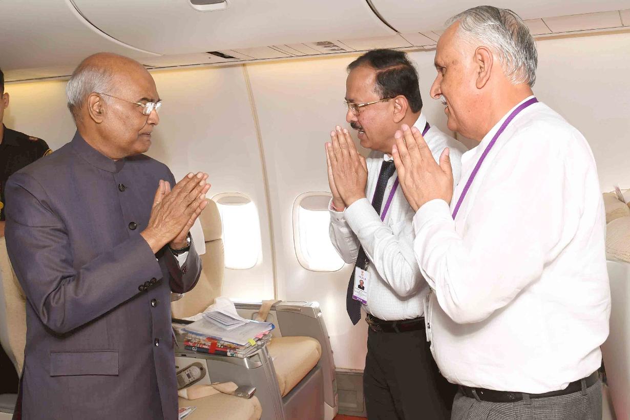 | Caption: | The President of India, Shri Ram Nath Kovind interacting with his official delegation, Dr. Subhash Ramrao Bhamre, Minister of State for Defence and Shri Shamsher Singh Manhas, Member of Parliament, at Air India Special Aircraft on the way to Tajikistan on October 07, 2018. |