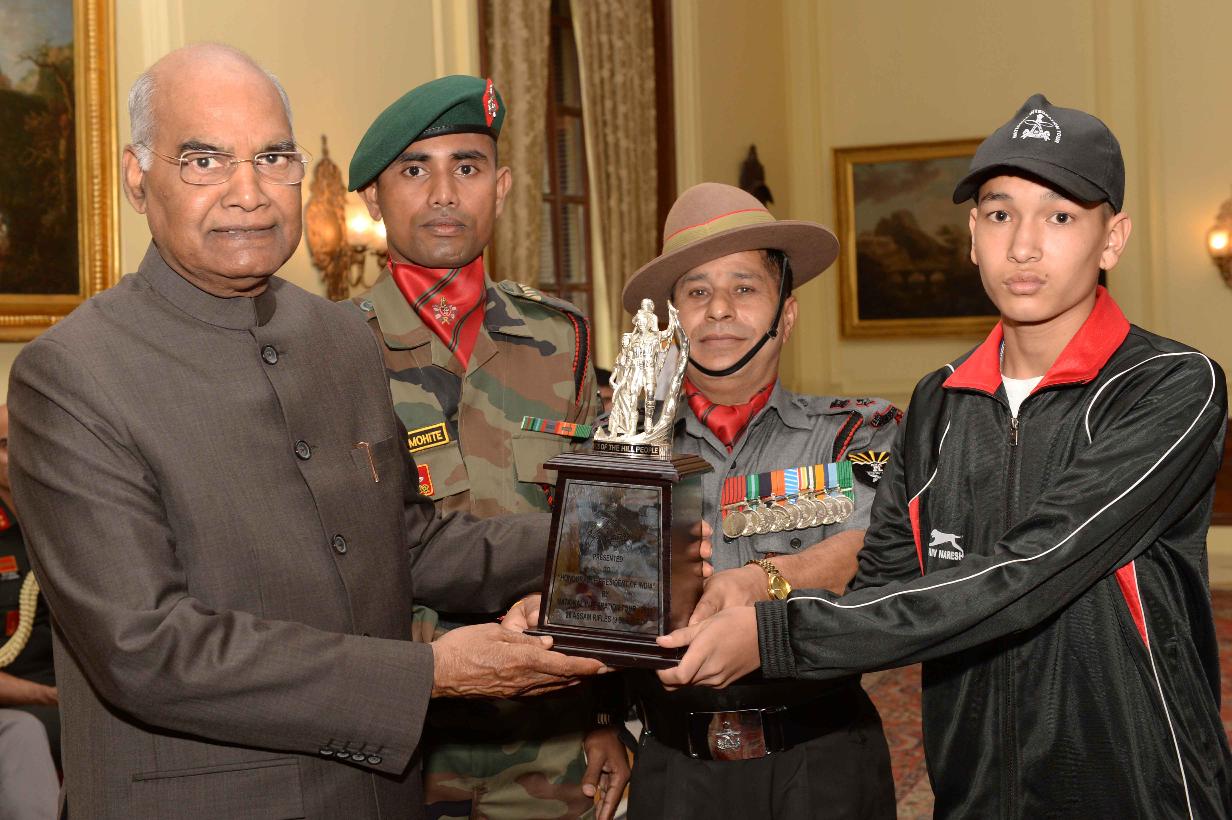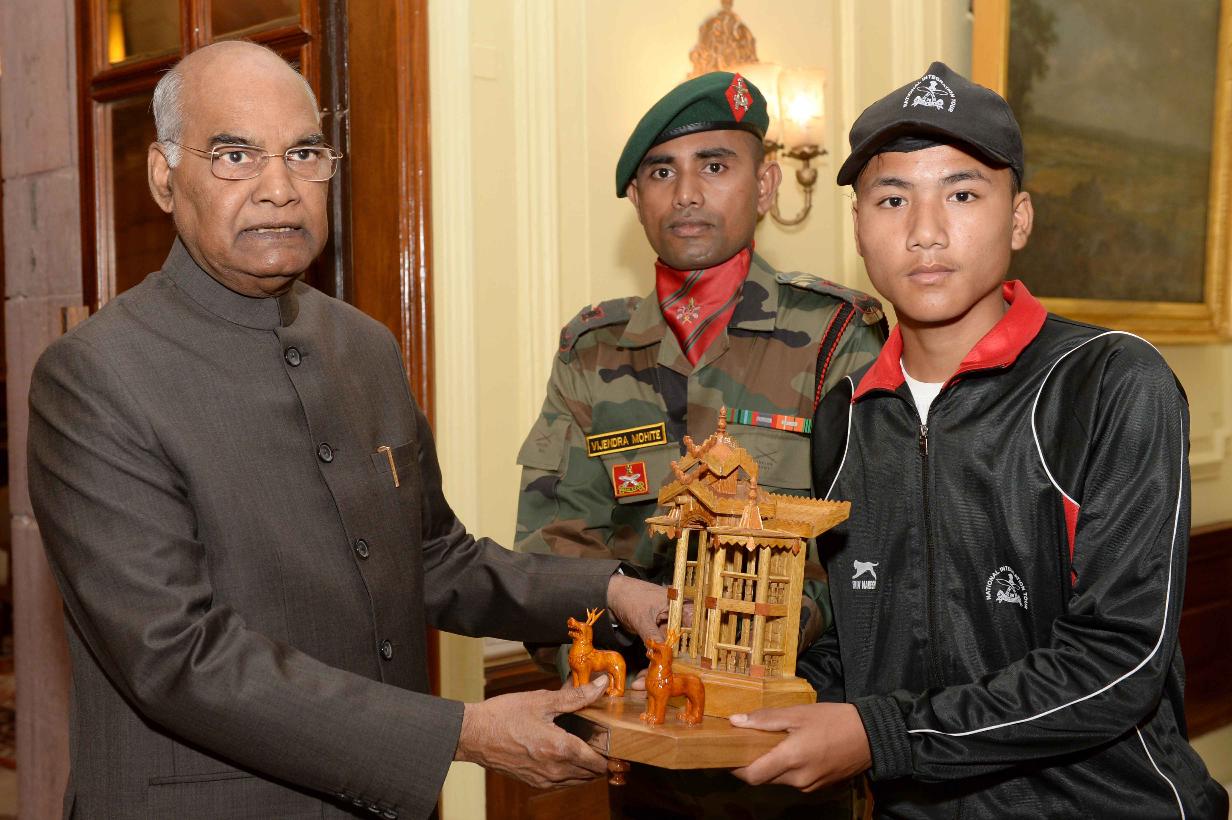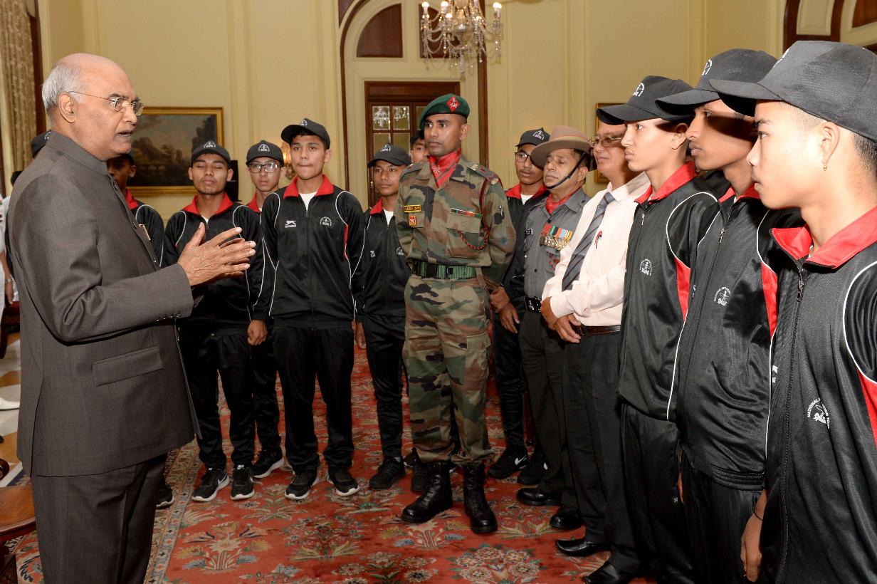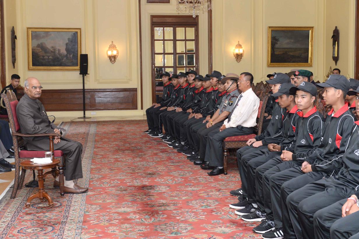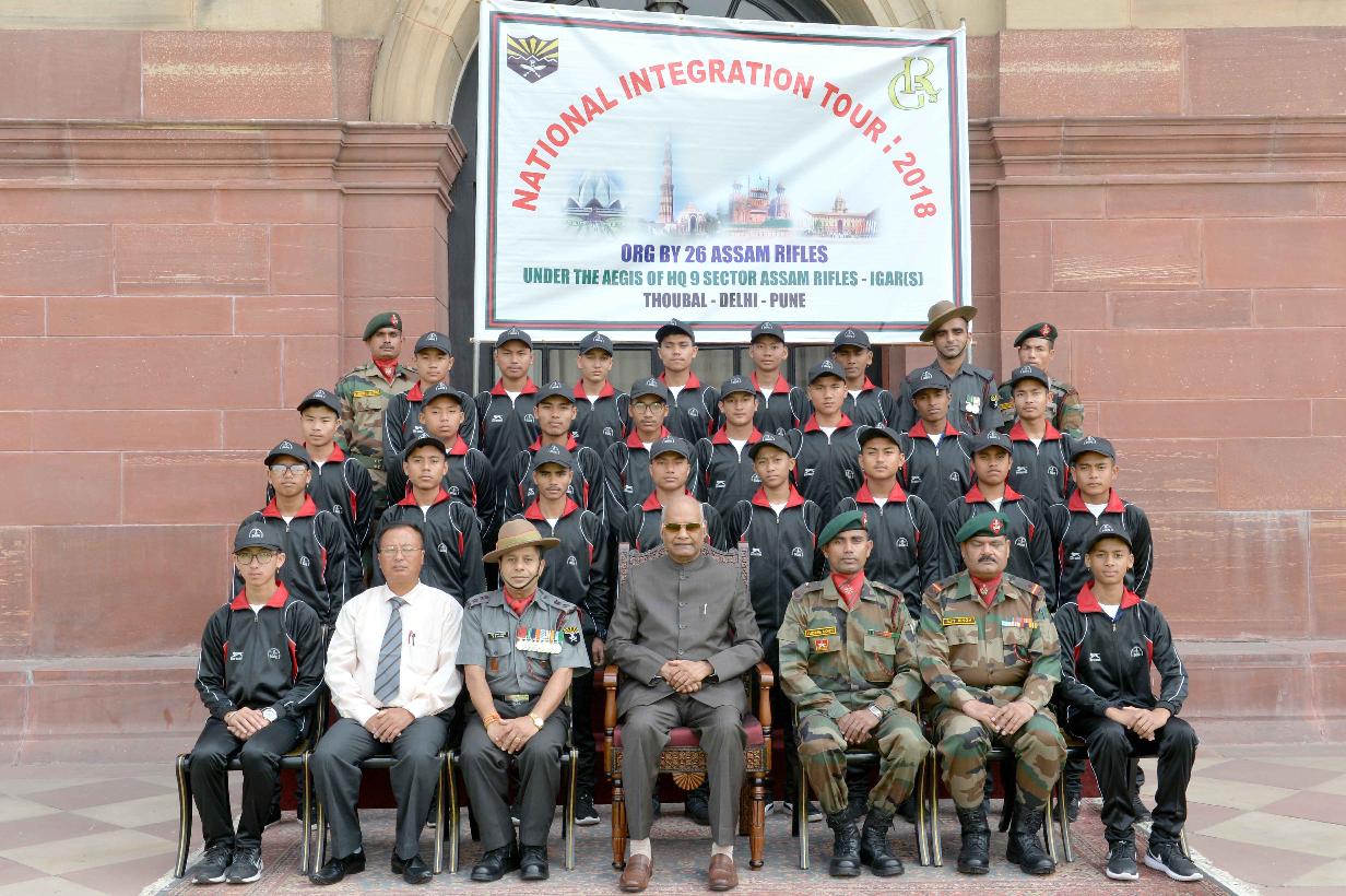 | Caption: | The President of India, Shri Ram Nath Kovind meeting with the students and teachers from Manipur attending National Integration Tour, organised by 9 Sector Assam Rifles, at Rashtrapati Bhavan on October 05, 2018. |