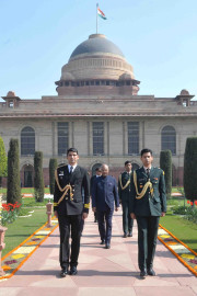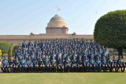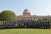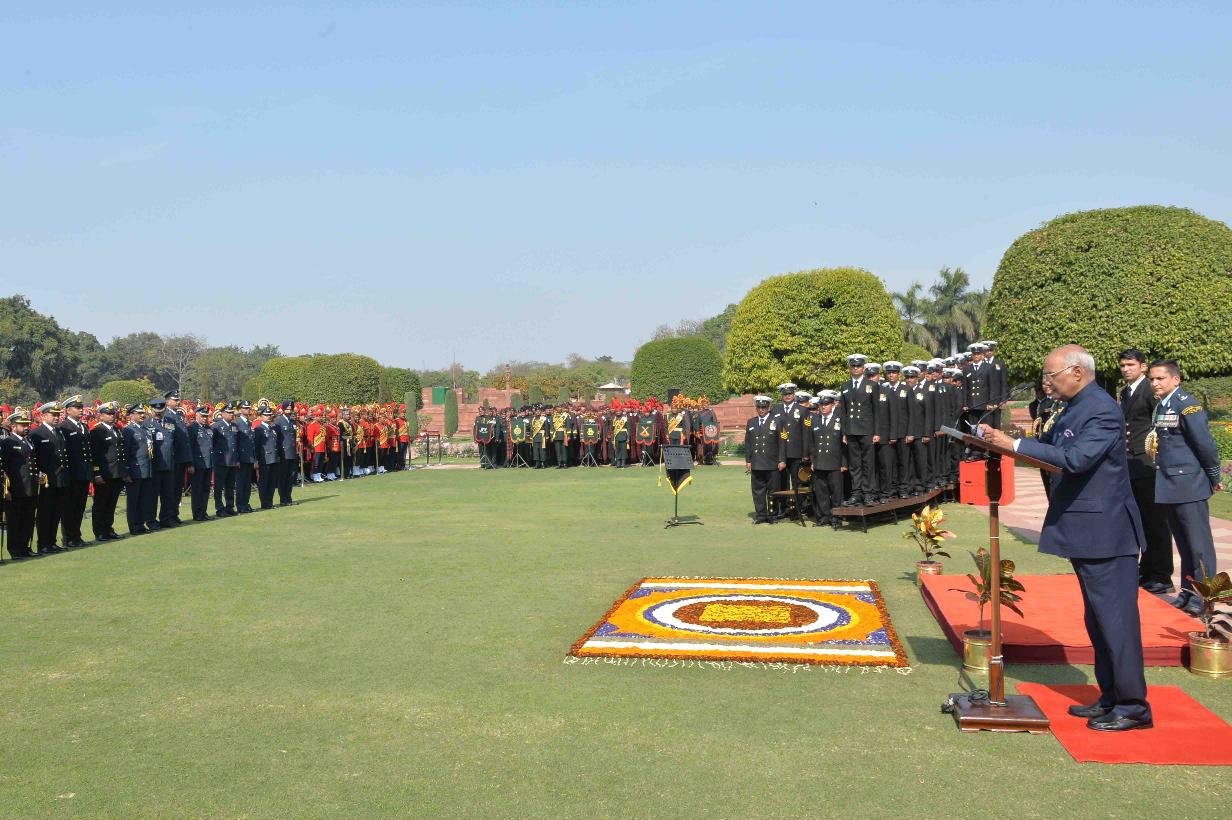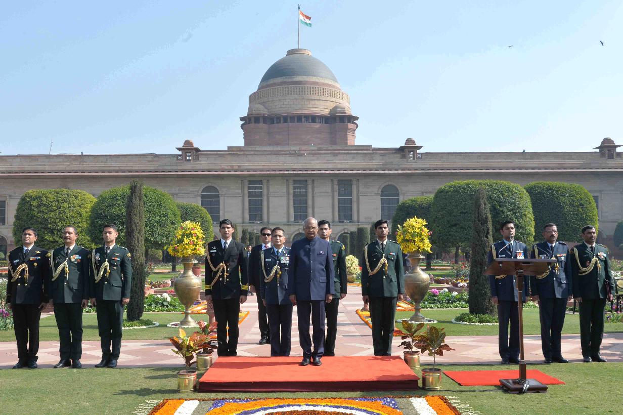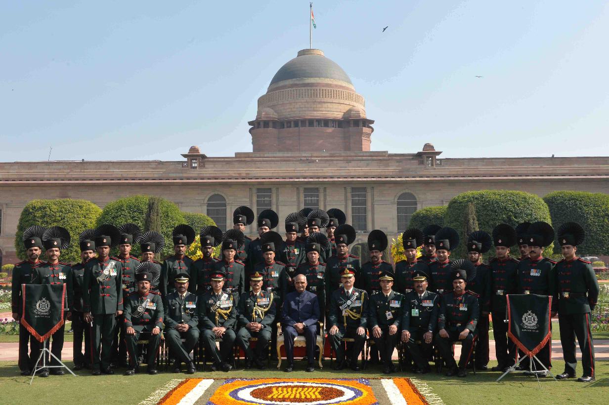 | Caption: | The President of India, Shri Ram Nath Kovind with the Personnel of the Tri Service Band Contingents (participants of the Beating Retreat Ceremony) and Provost Outrides of the Three Services, at Rashtrapati Bhavan on January 30, 2018. |