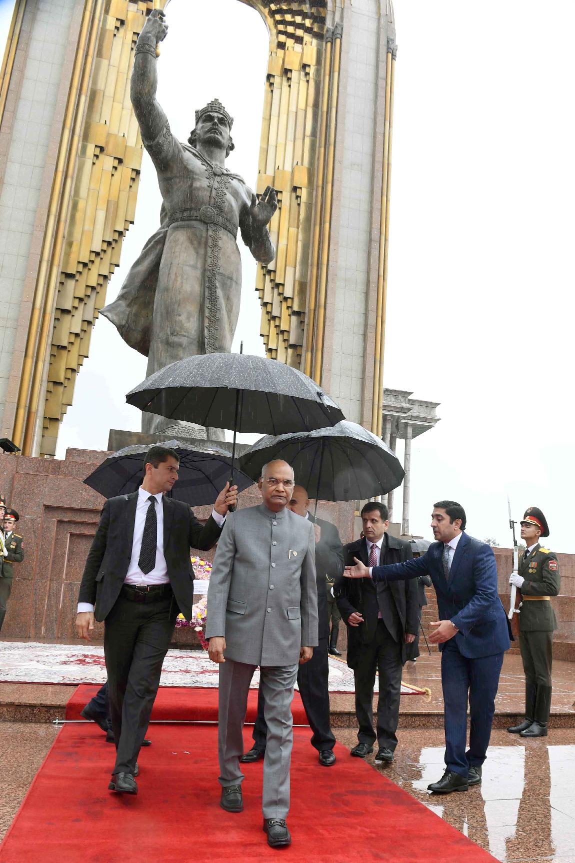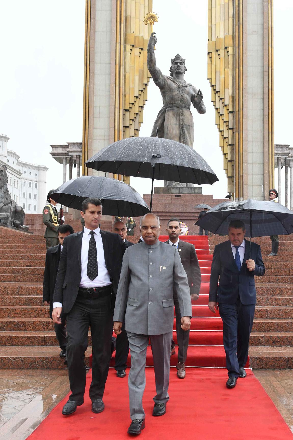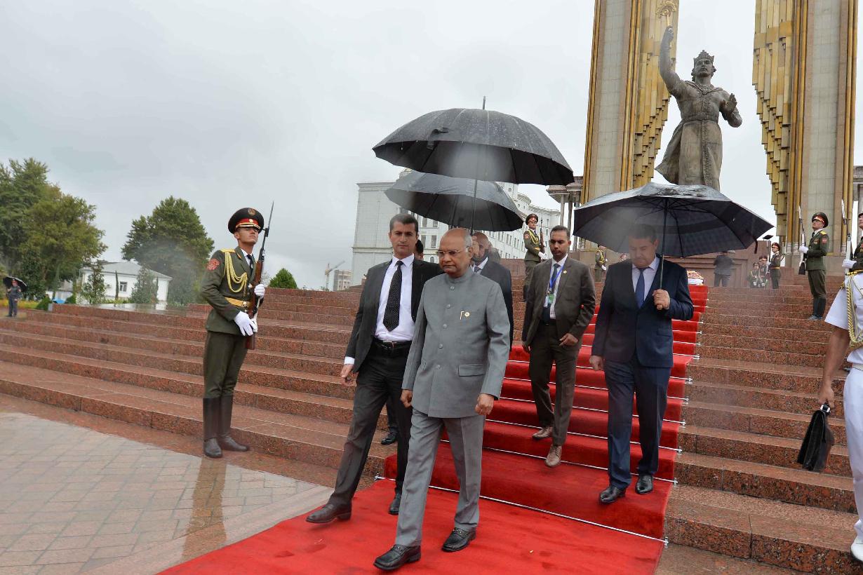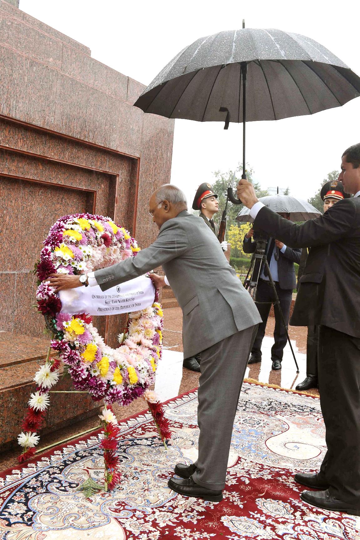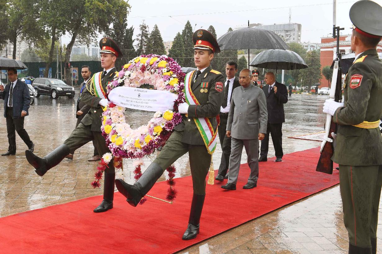 | Caption: | The President of India, Shri Ram Nath Kovind laying wreath, at Ismail Somani Memorial, Dushanbe, in Tajikistan on October 08, 2018. |