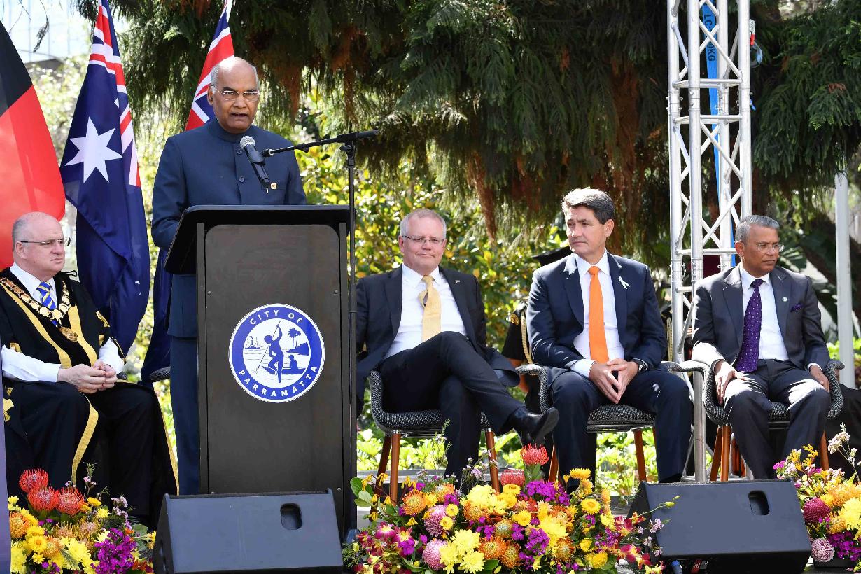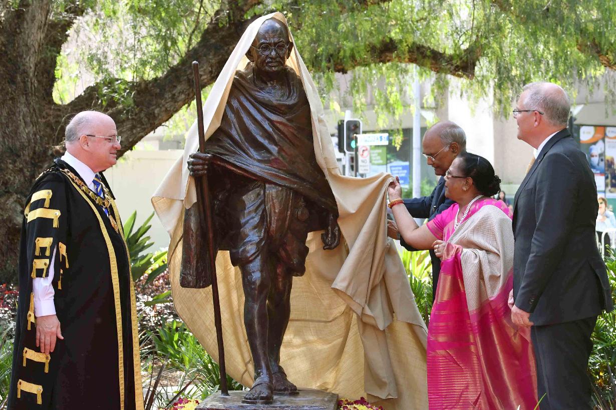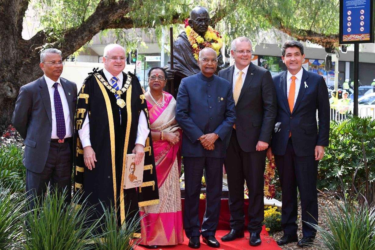 | Caption: | The President of India, Shri Ram Nath Kovind unveiling the Statue of Mahatma Gandhi, at Jubilee Park, in Sydney on November 22, 2018. The Prime Minister of Australia, H.E. Mr. Scott Morrison and the Lord Mayor of City of Parramatta, Mr. Andrew Wilson were also present on the occasion. |