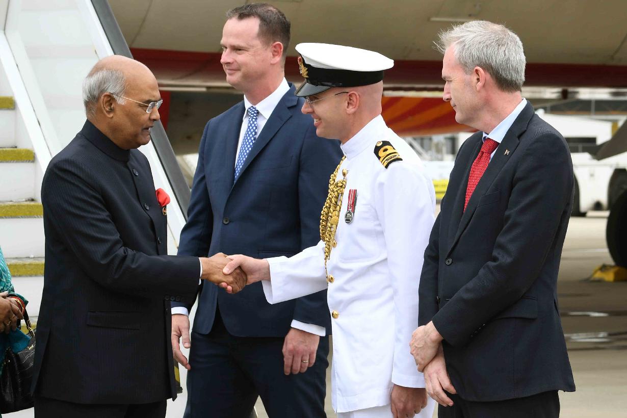 | Caption: | The President of India, Shri Ram Nath Kovind being received by the Acting Official Secretary of Governor General of Australia, Mr. Paul Singer MVO and other Government officials, on his arrival, at Sydney (Kingsford-Smith) Airport, in Australia on November 21, 2018. |