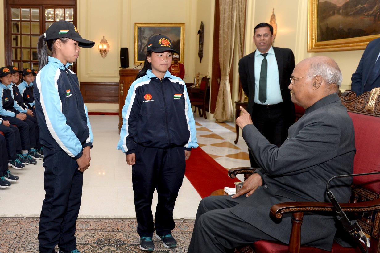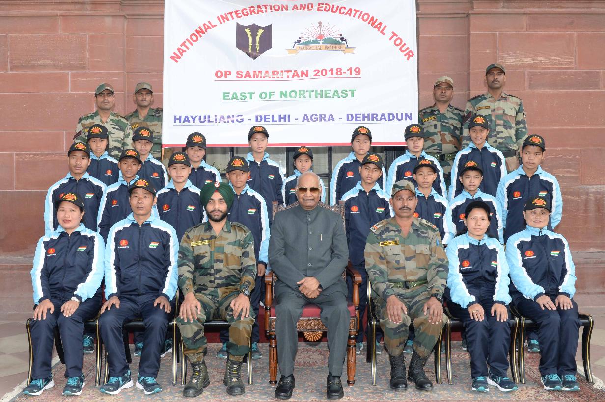| Caption: | The President of India, Shri Ram Nath Kovind meeting with the students from Hayuliang, Anjaw district of Arunachal Pradesh, attending National Integration Tour, organised by 20 BN The Rajputana Rifles under 'Op Samaritan', at Rashtrapati Bhavan on December 08, 2018. |