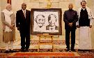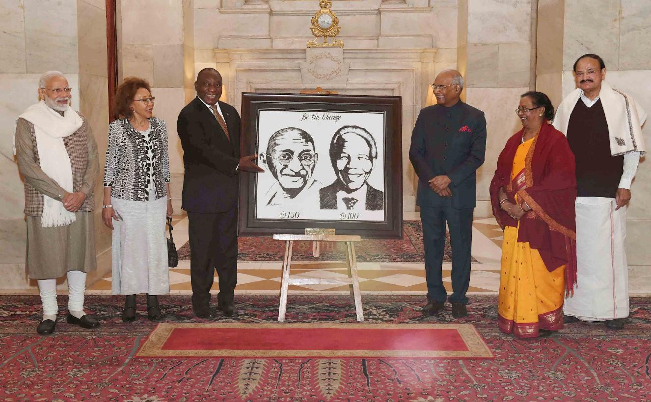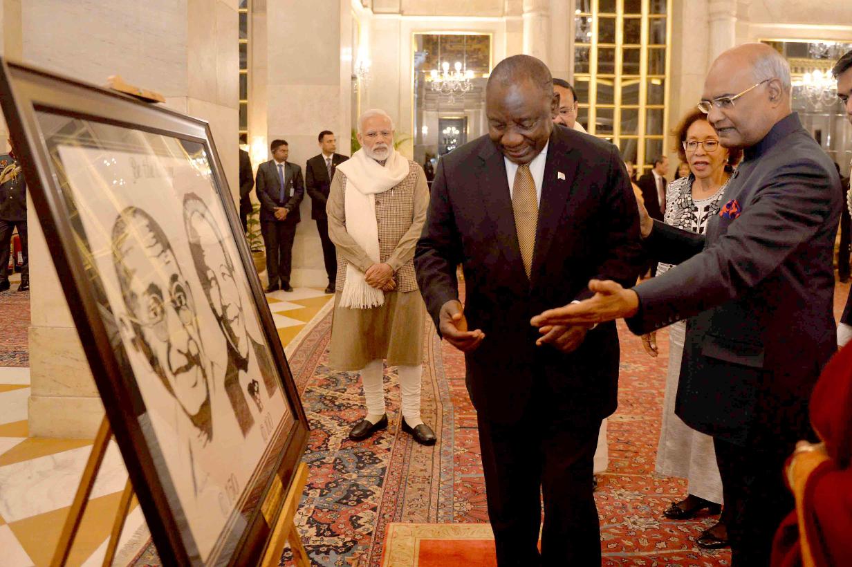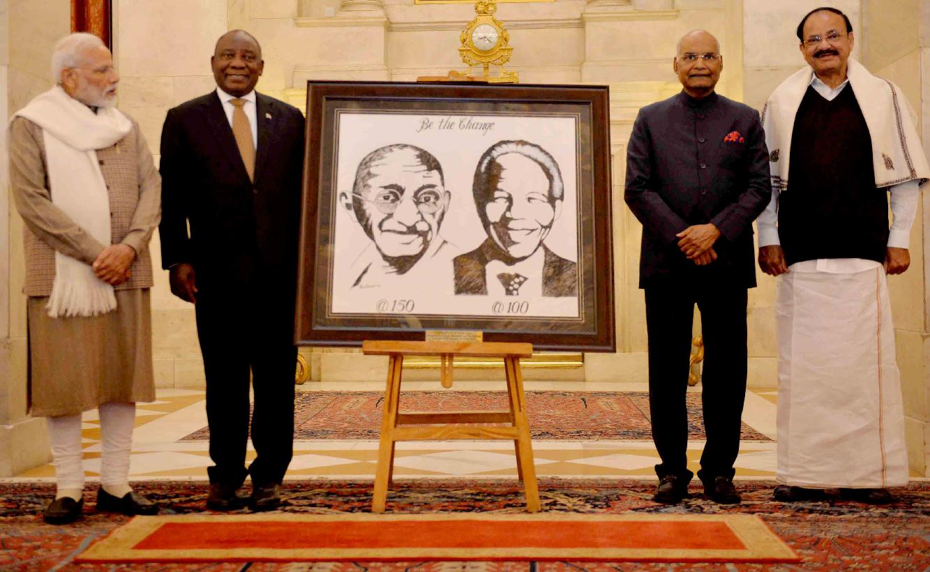 | Caption: | The President of India, Shri Ram Nath Kovind presenting a painting of Mahatma Gandhi and Nelson Mandela to the President of the Republic of South Africa, H.E. Mr. Matamela Cyril Ramaphosa, at Rashtrapati Bhavan on January 25, 2019. |