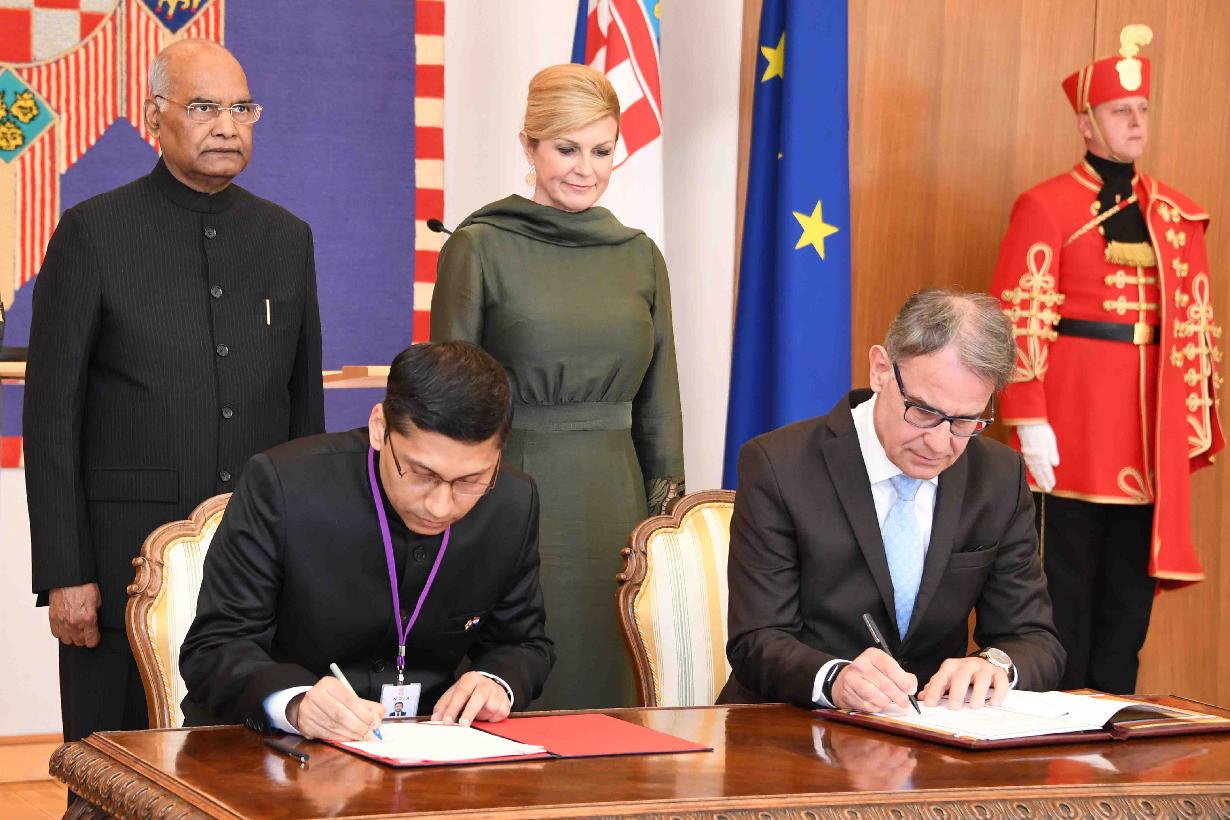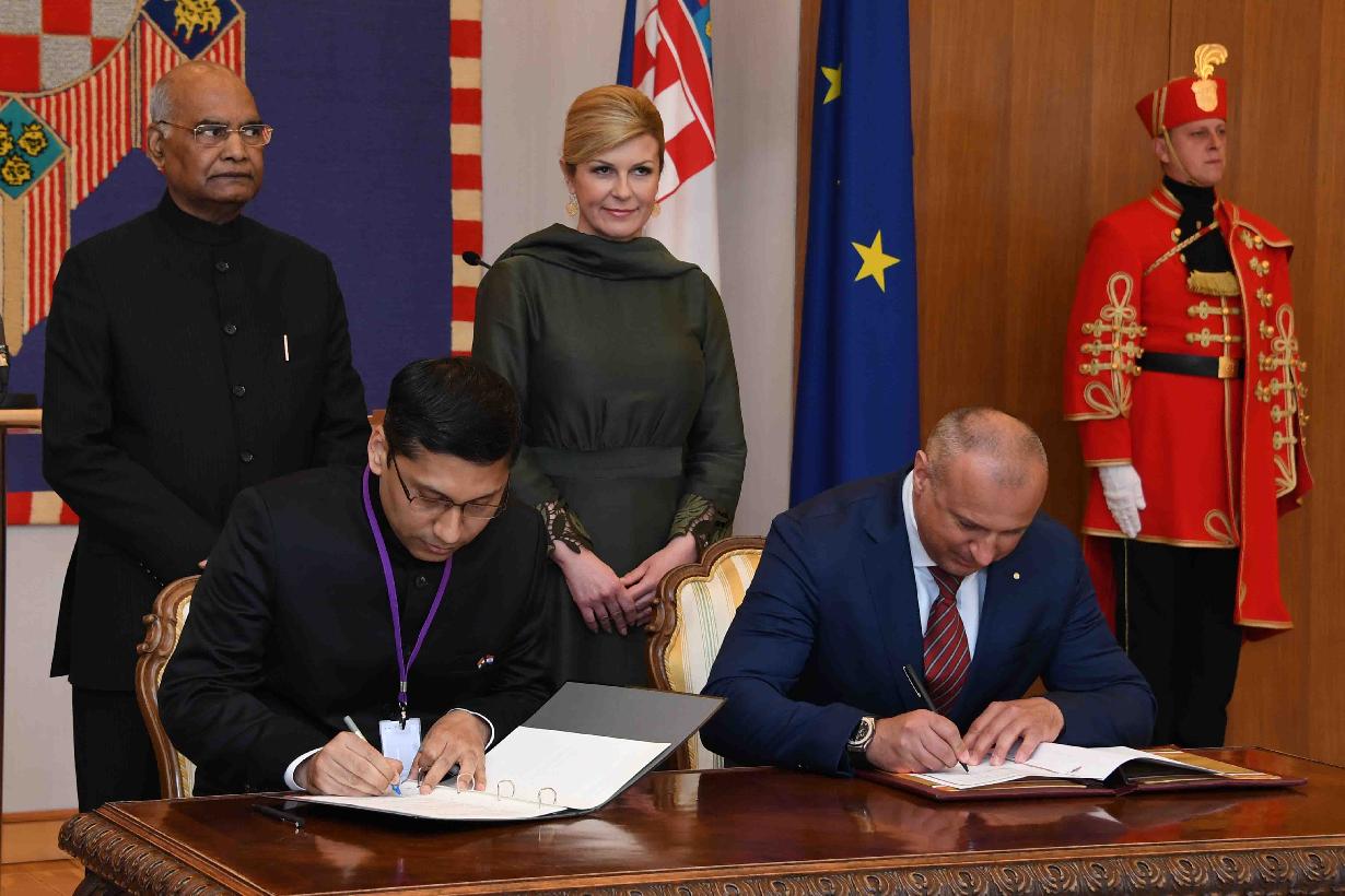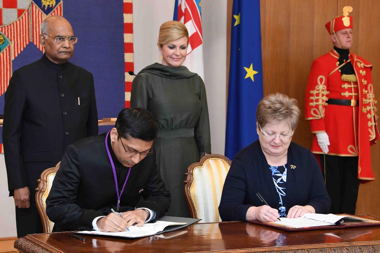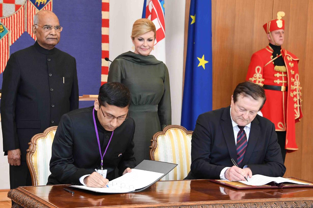 | Caption: | The President of India, Shri Ram Nath Kovind and the President of Croatia, Mrs. Kolinda Grabar-Kitarovic witnessing the signing of agreements between India and Croatia, at the Office of the President, Zagreb, in Croatia on March 26, 2019. |