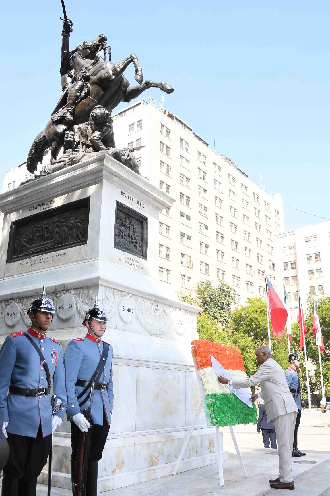 | Caption: | The President of India, Shri Ram Nath Kovind laying wreath at Monumento Al Libertador General Bernardo O'Higgins, Santiago, in the Republic of Chile on April 01, 2019. |