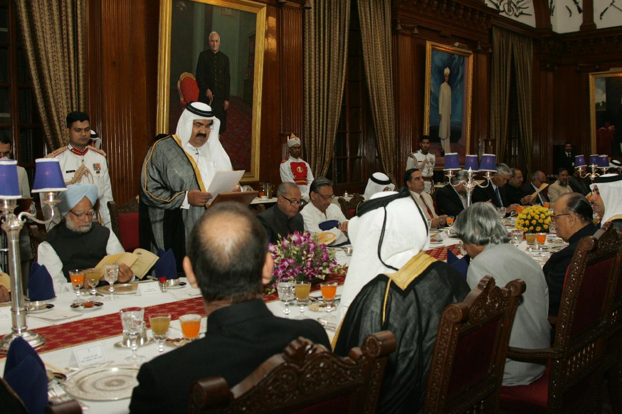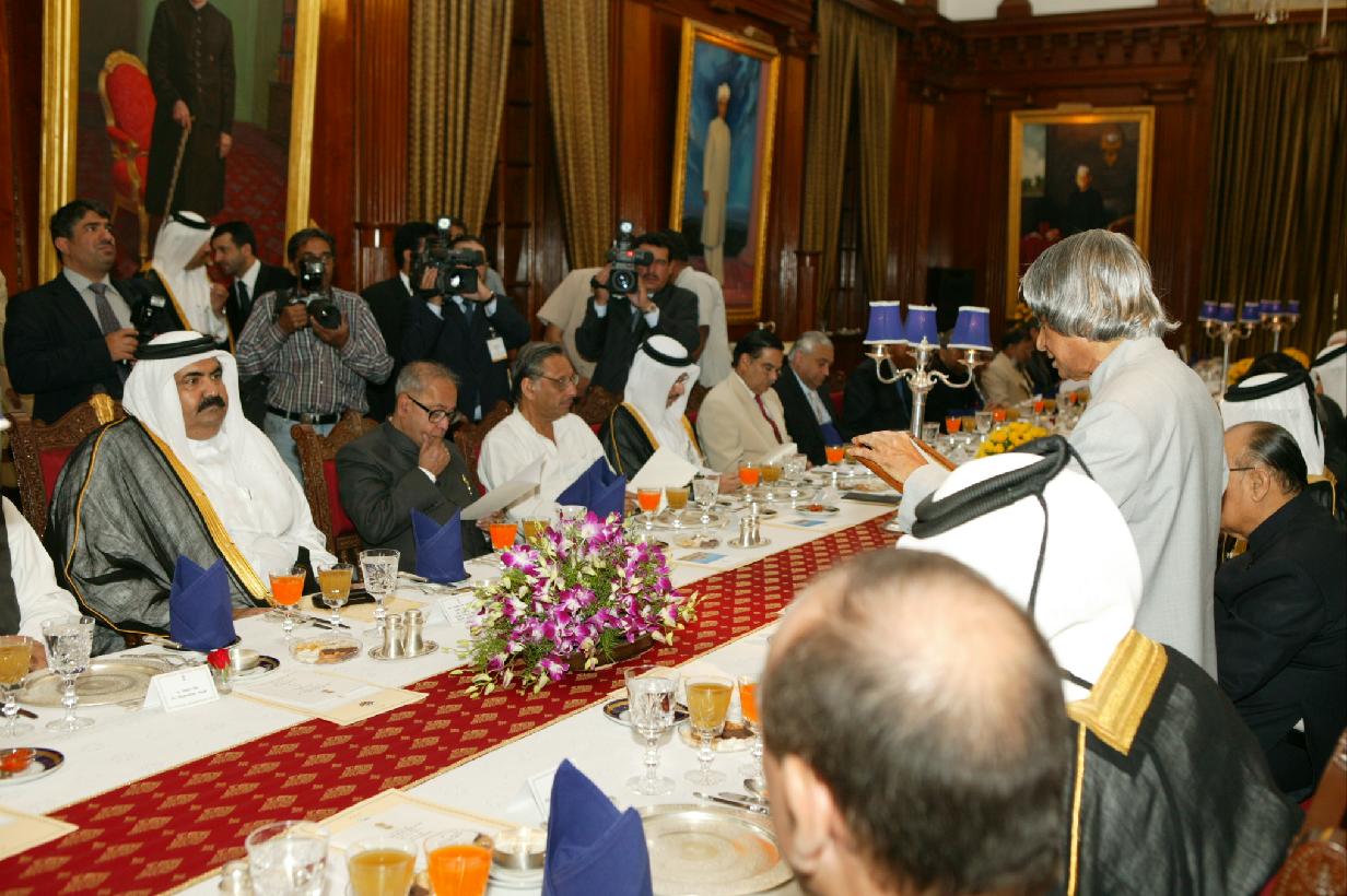 | Caption: | The President of India, Dr A P J Abdul Kalam at the Banquet Hosted in Honour of the Emir of State of Qatar, H H Sheikh Hamad Bin Khalifa AI-Thani at the Banquet Hall of Rashtrapati Bhavan in New Delhi on April 14, 2005 |