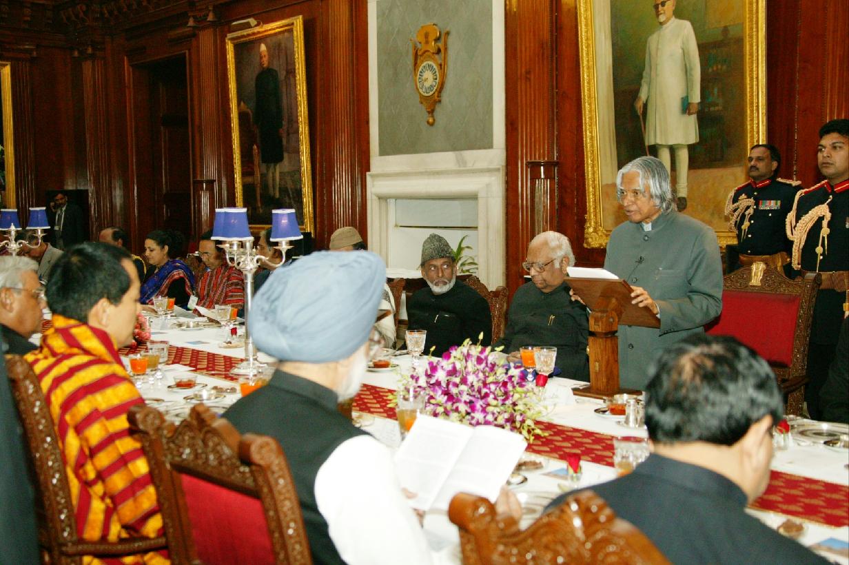 | Caption: | The President of India, Dr A P J Abdul Kalam at the Banquet Hosted in Honour of the King of Bhutan, His Majesty Jigme Singye Wangchuck at the Banquet Hall of Rashtrapati Bhavan in New Delhi on Jan 25, 2005 |