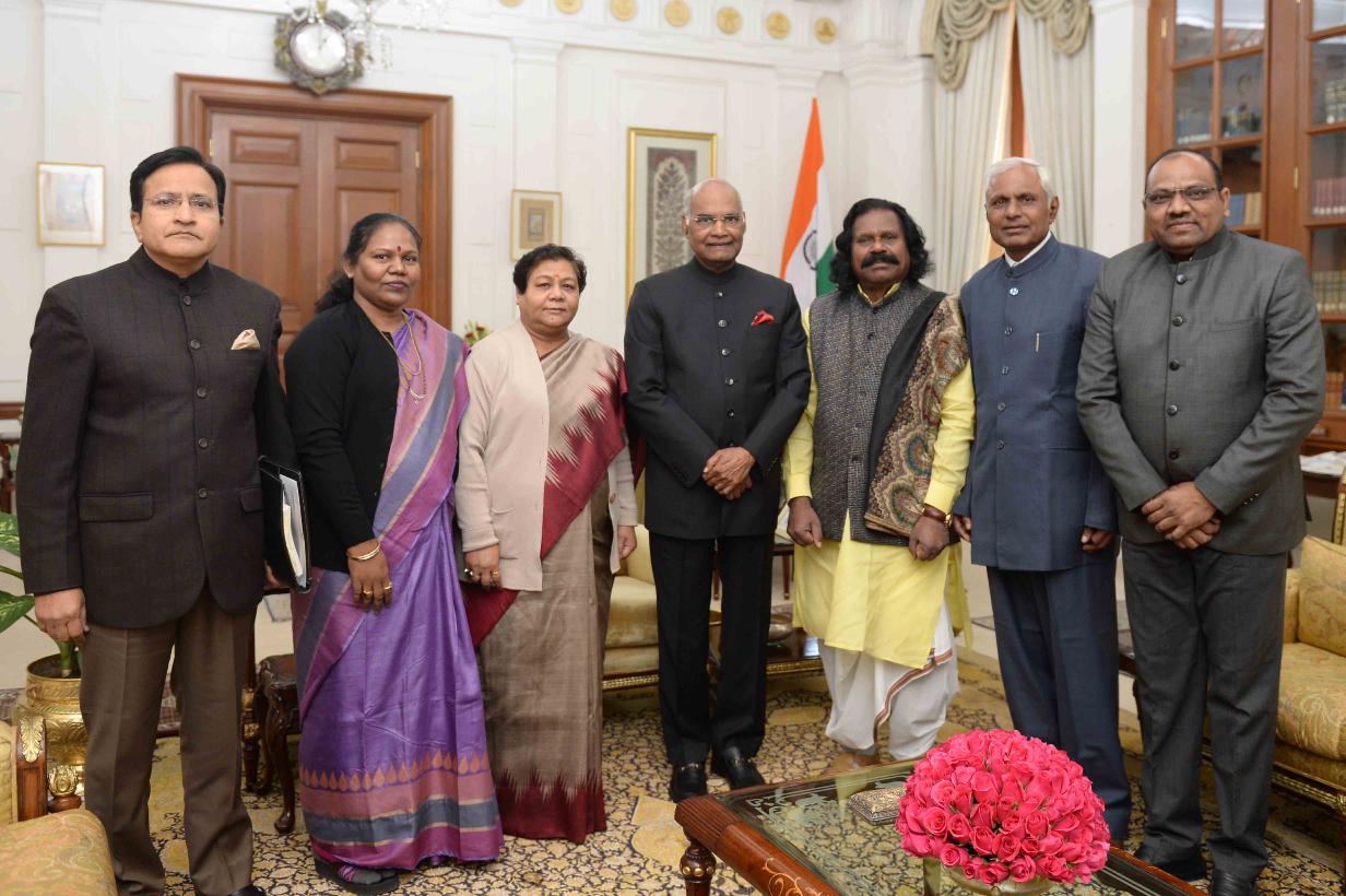 | Caption: | The Chairman, Shri Nand Kumar Sai along with the Vice Chairman and Members of the National Commission for Scheduled Tribes (NCST) meeting with the President of India, Shri Ram Nath Kovind, at Rashtrapati Bhavan on January 02, 2018. |