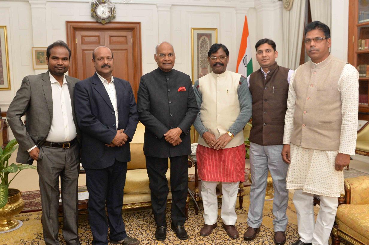 | Caption: | Shri Kamalbhan Singh Marabi, MP (LS) from Surguja, Chhattisgarh with others meeting with the President of India, Shri Ram Nath Kovind, at Rashtrapati Bhavan on January 03, 2018. |