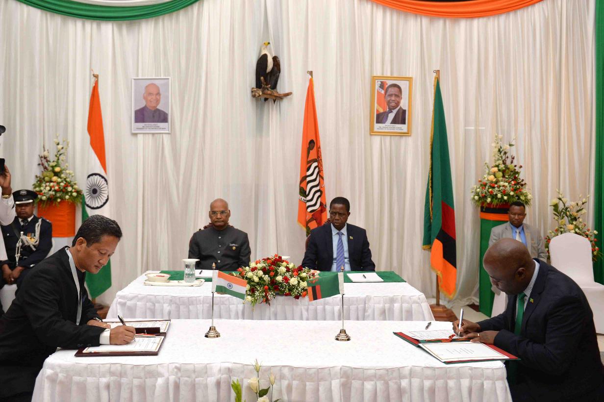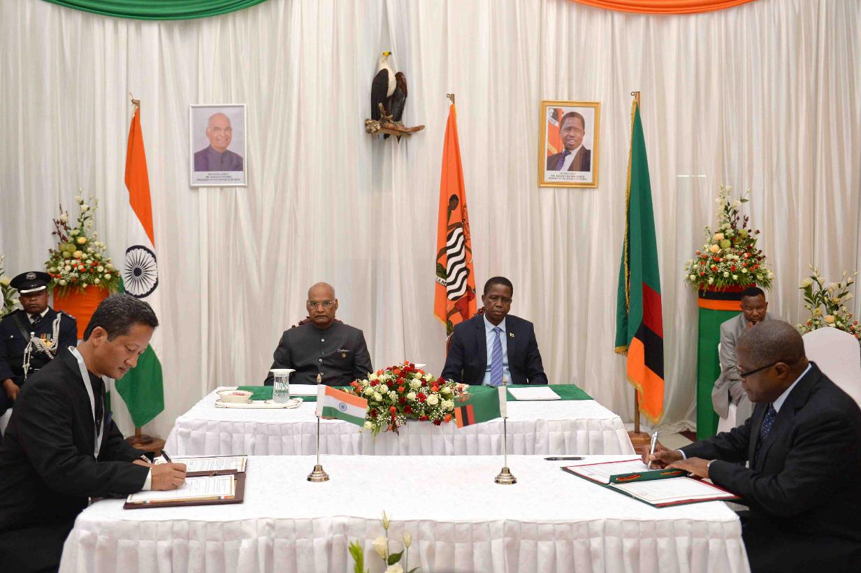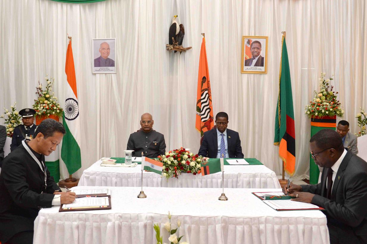| Caption: | The President of India, Shri Ram Nath Kovind and the President of the Republic of Zambia, H.E. Mr. Edgar Chagwa Lungu witnessing the signing of agreements between two countries on double taxation avoidance |