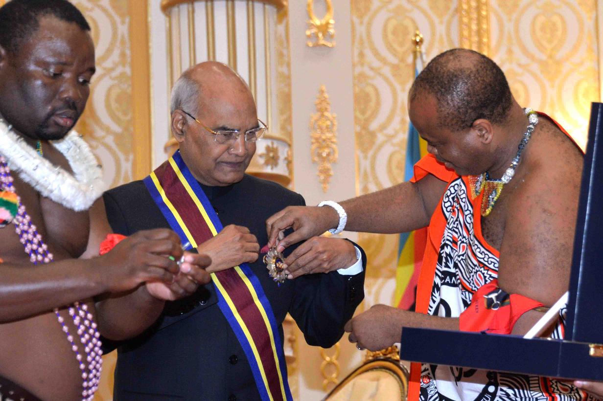 | Caption: | The President of India, Shri Ram Nath Kovind receiving the order of Lion from His Majesty Mswati III, the King of Swaziland, at Lozitha Palace, in Swaziland on April 09, 2018. |