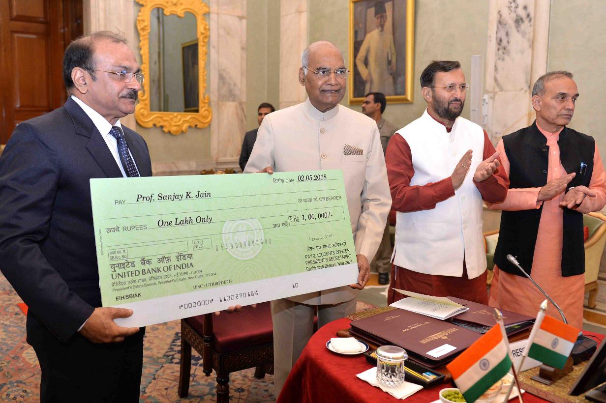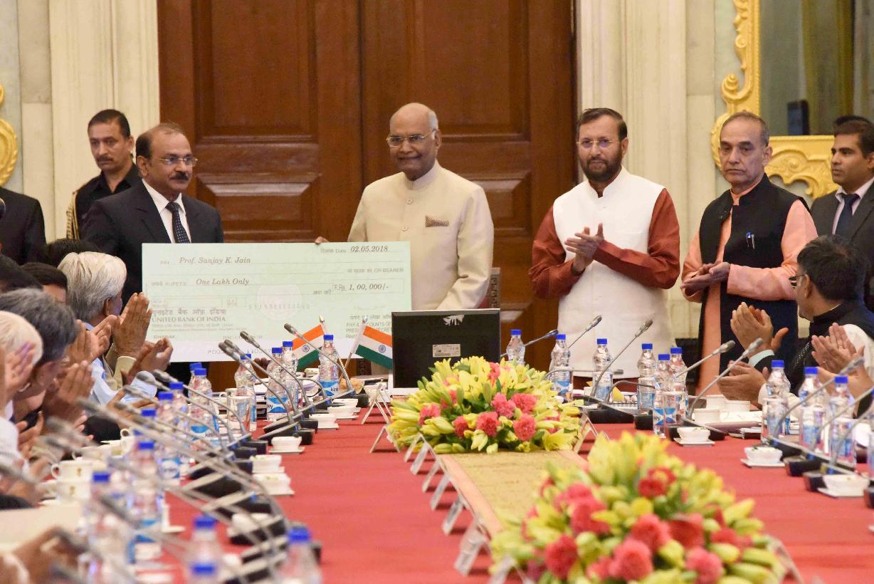 | Caption: | The President of India, Shri Ram Nath Kovind presenting the Visitor s Award to Prof. Sanjay K. Jain, Dr. Hari Singh Gour Vishwavidyalaya, Sagar, Madhya Pradesh for research in the field of Basic and Applied Science, during the meeting of Vice Chancellors of Central Universities, at Rashtrapati Bhavan on May 02, 2018. |